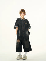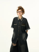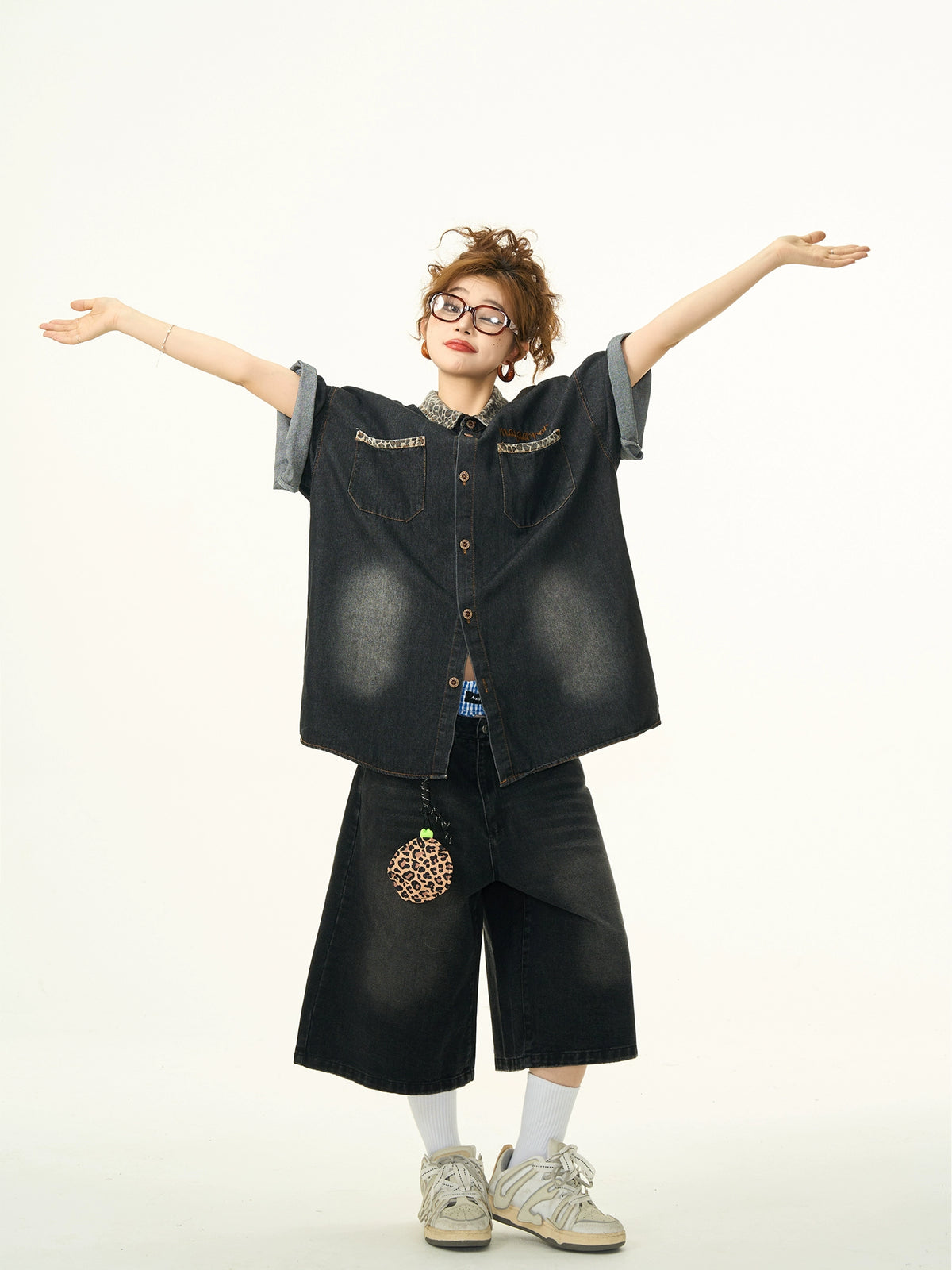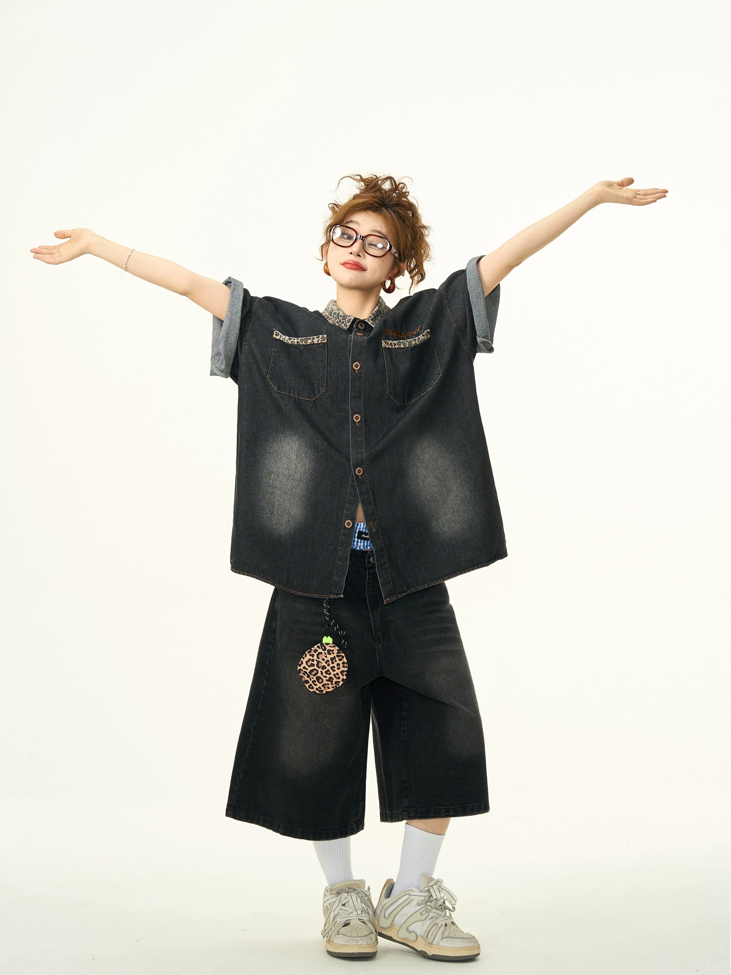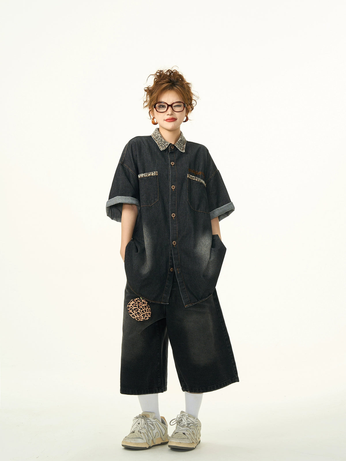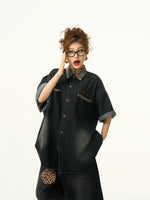 Leopard-Patchwork-Denim-Hemd mit kurzen Ärmeln