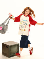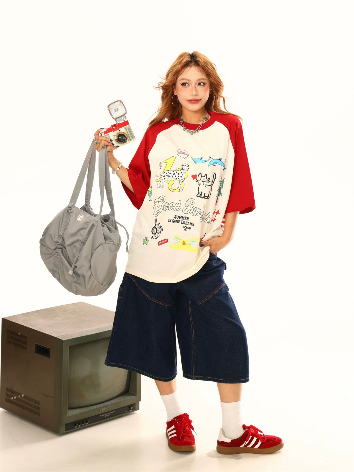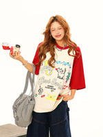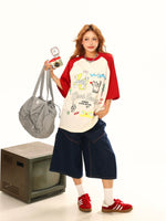 T-Shirt mit Cartoon-Druck und Kontrastärmeln