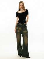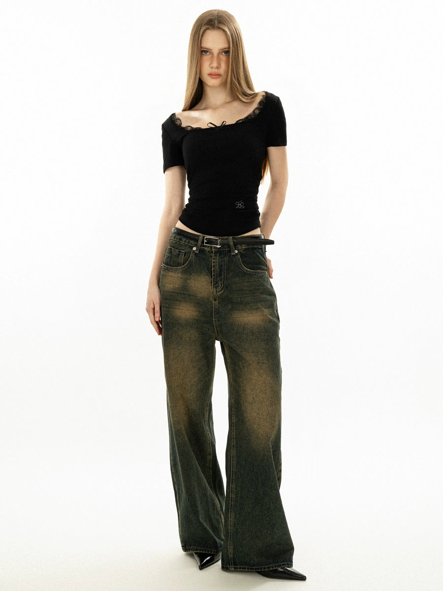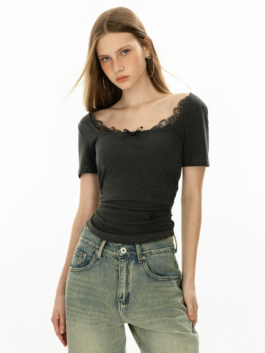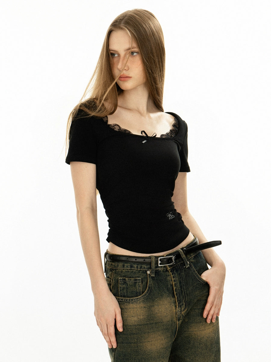 Spitzen-Quadrat-Ausschnitt Kurzarm-Top
