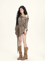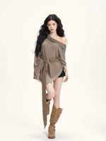 - Das lockere lange T-Shirt mit einem Taillengürtel betont die Taille.