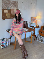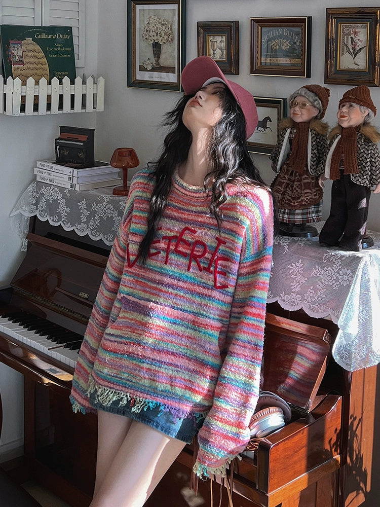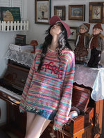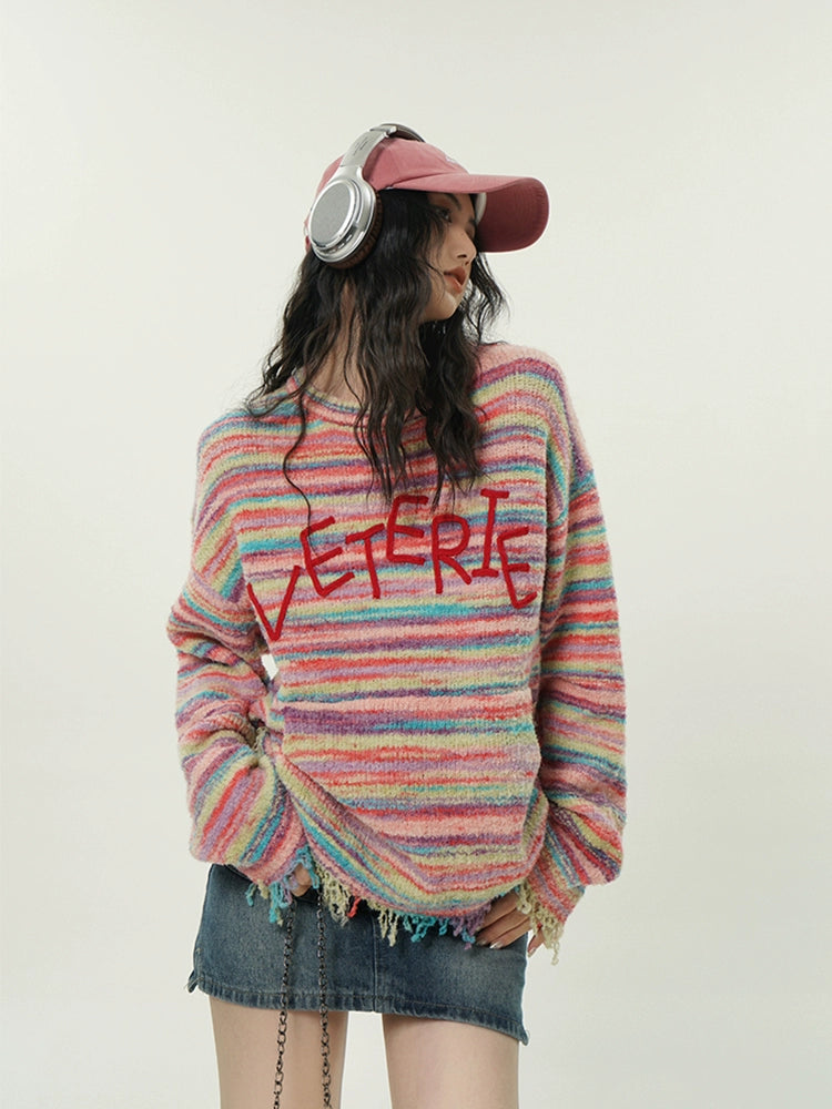 Retro Regenbogen gestreifter lockerer Strickpullover