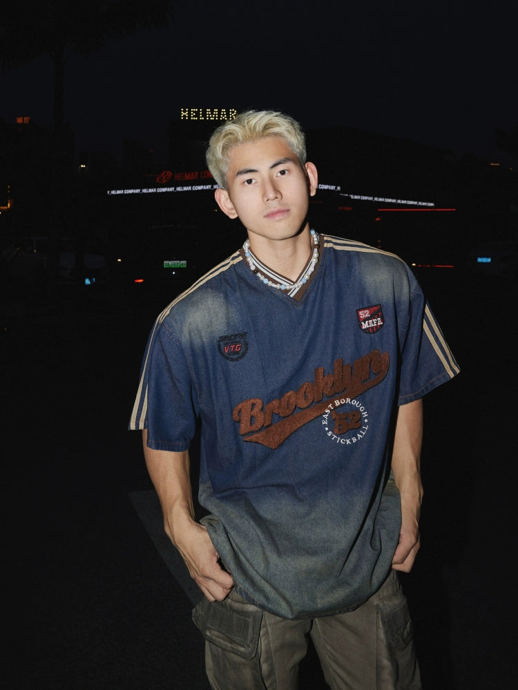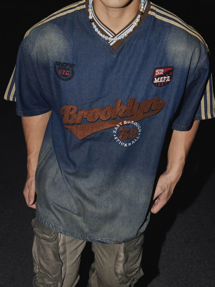 Denim besticktes Buchstaben lockeres Pullover-Shirt