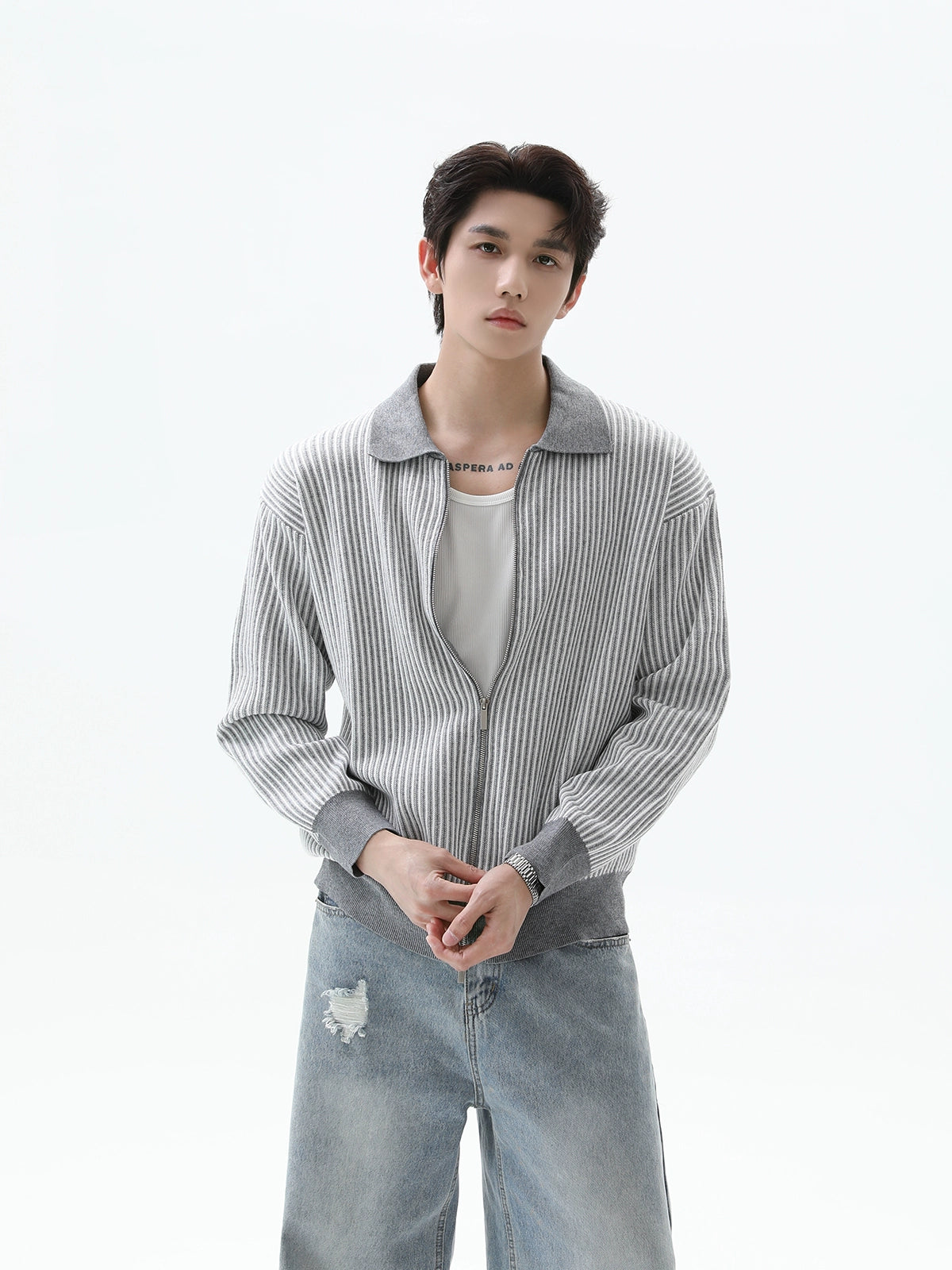Gestreifter Strick-Doppelreißverschluss-Revers-Cardigan