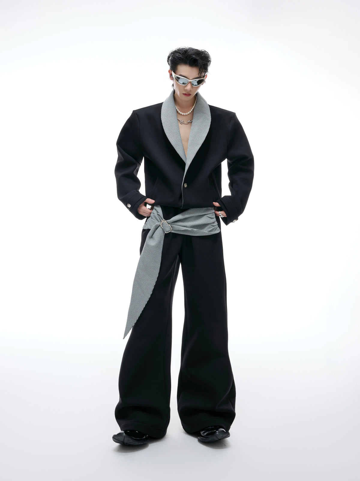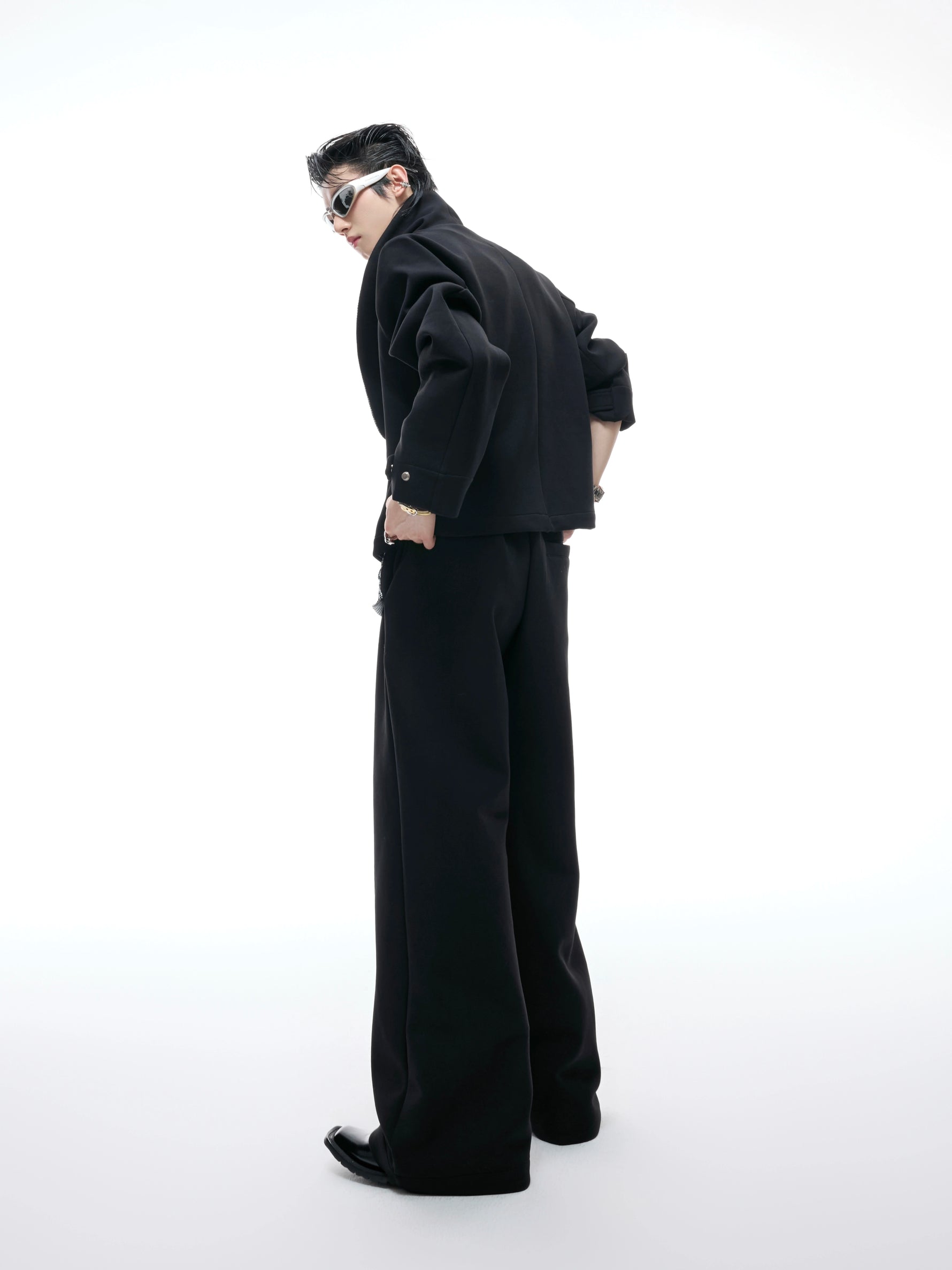 V-Ausschnitt Anzugjacke und weite Beinhosen