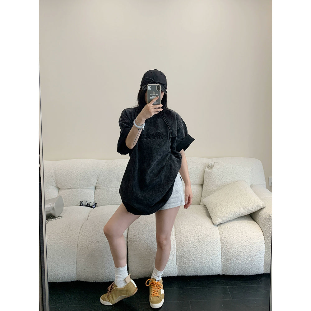 Distressed Embroidered Washed Short Sleeve Turtleneck