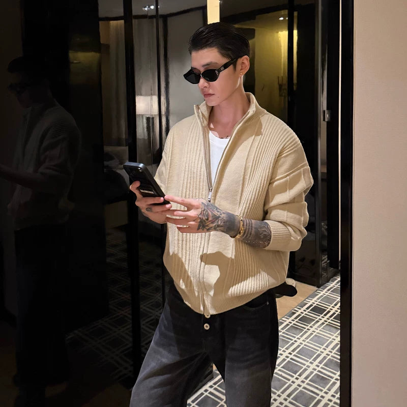 Stand Collar Ribbed Knit Cardigan