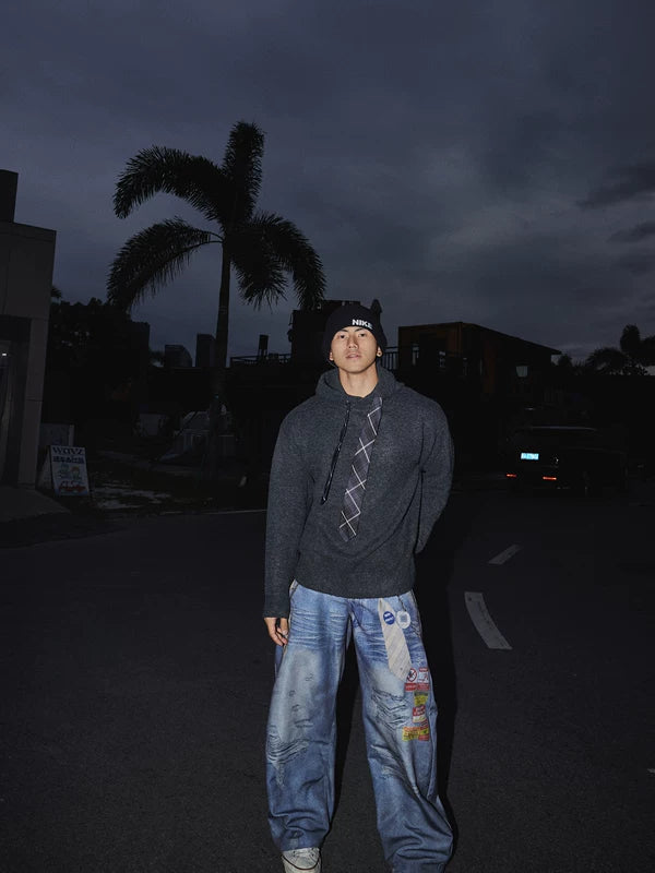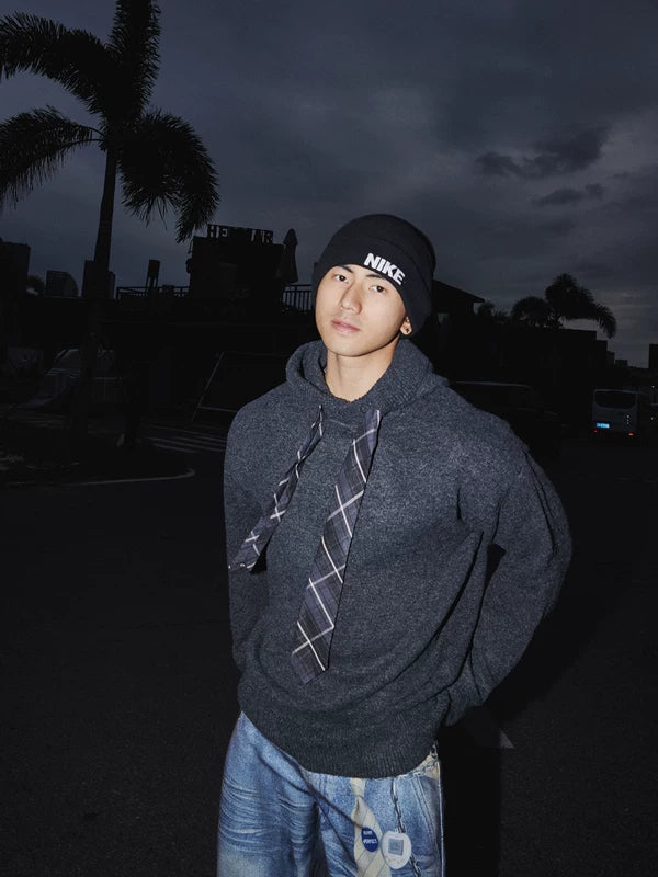 Casual Plaid Tie Knit Hooded Sweatshirt