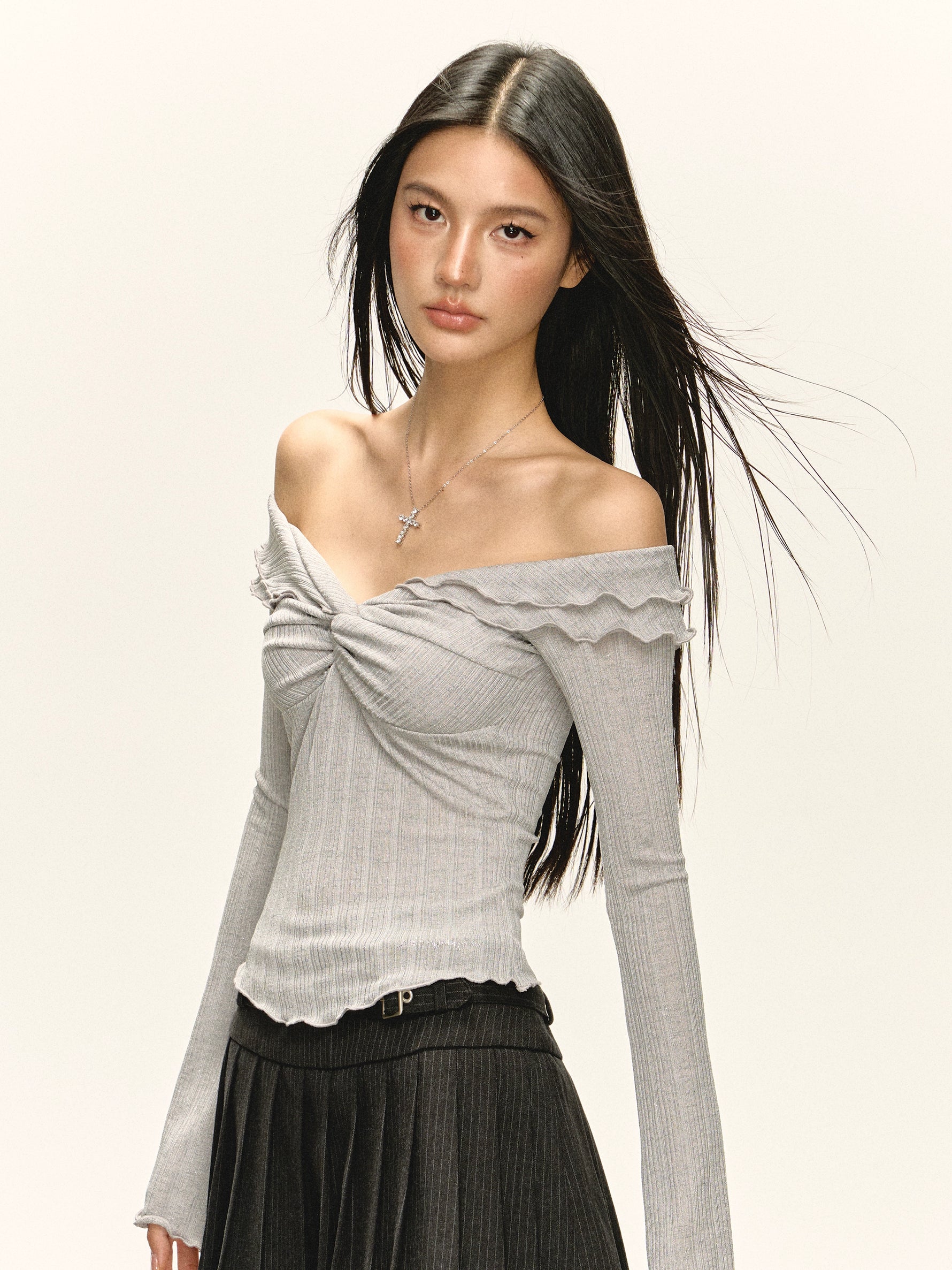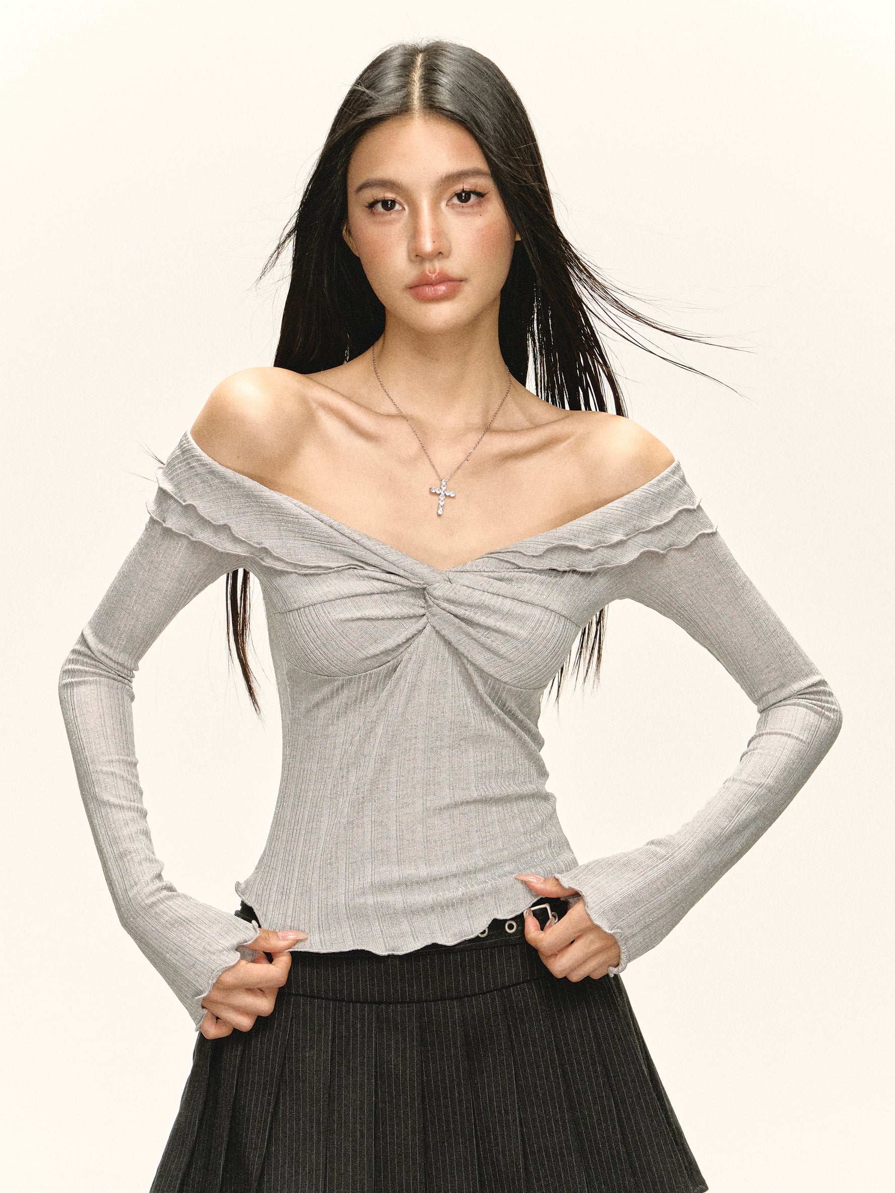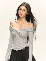 Off Shoulder Ruched Ribbed Long Sleeve Top
