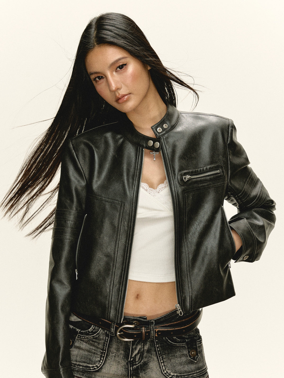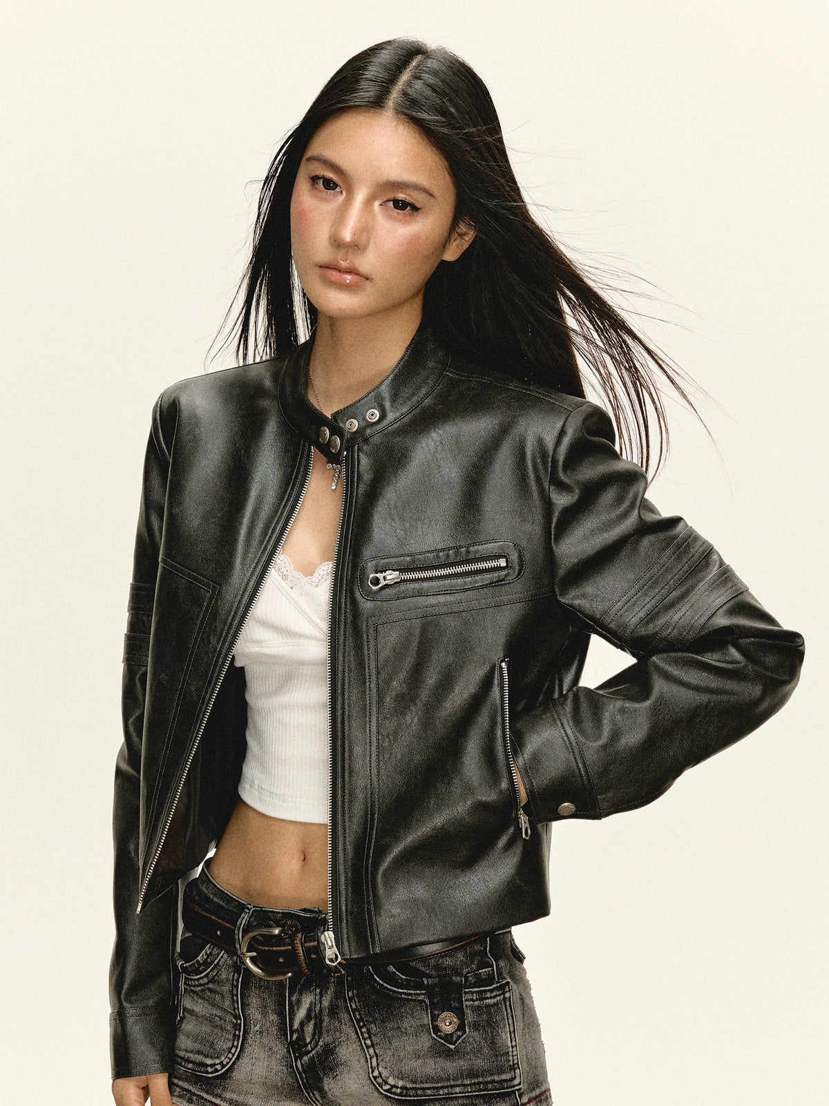 PU Leather Short Zip-Up Jacket