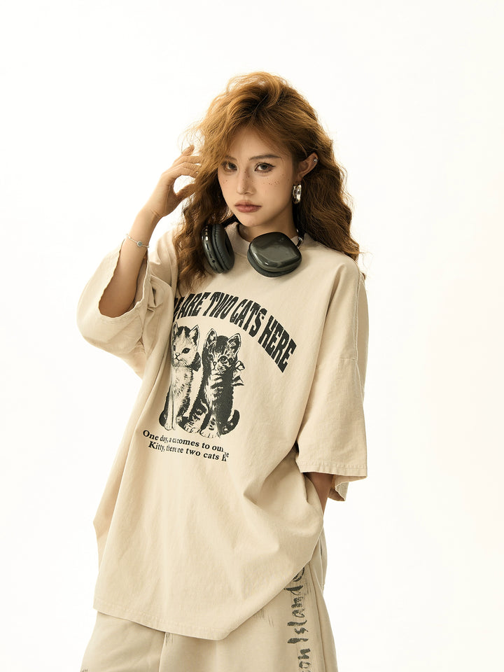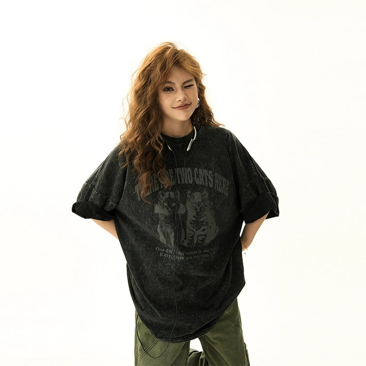 Retro Distressed Cat Print Oversized T-Shirt
