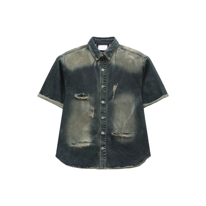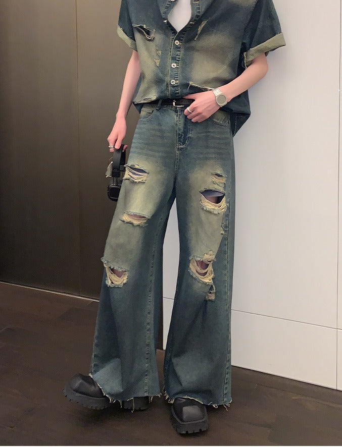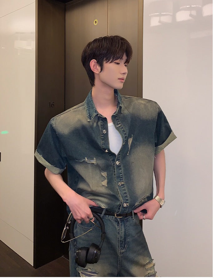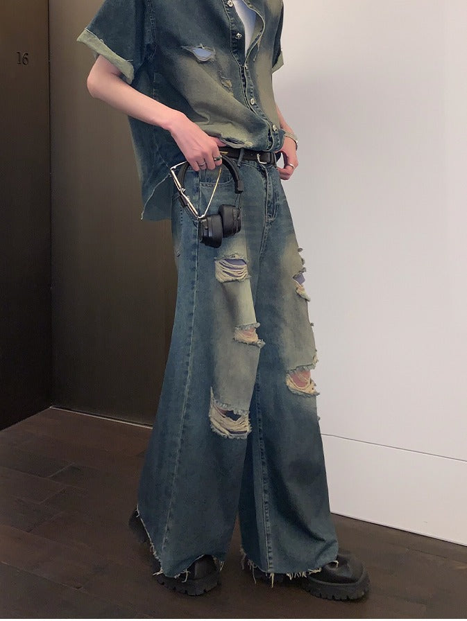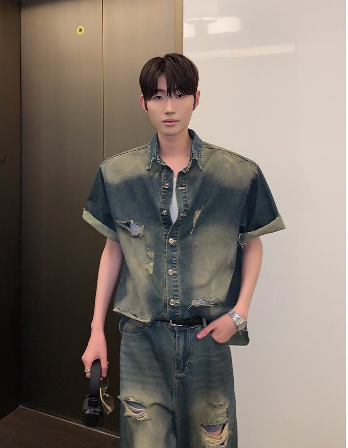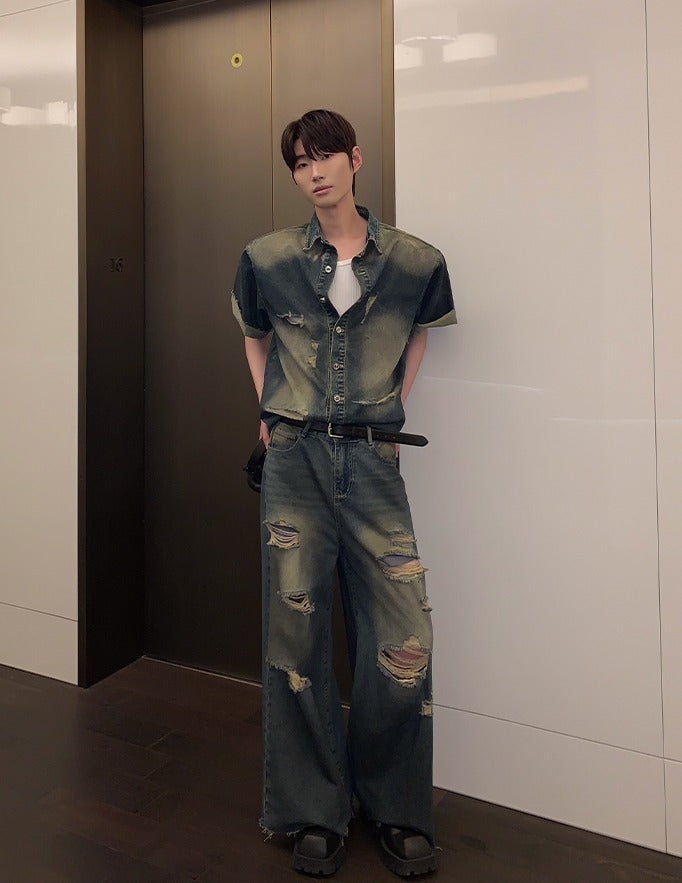 Distressed Denim Short Sleeve Jacket and Pants