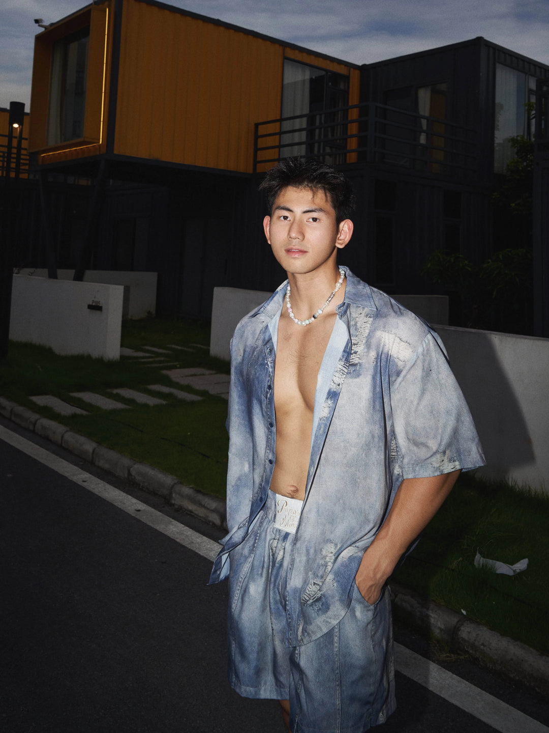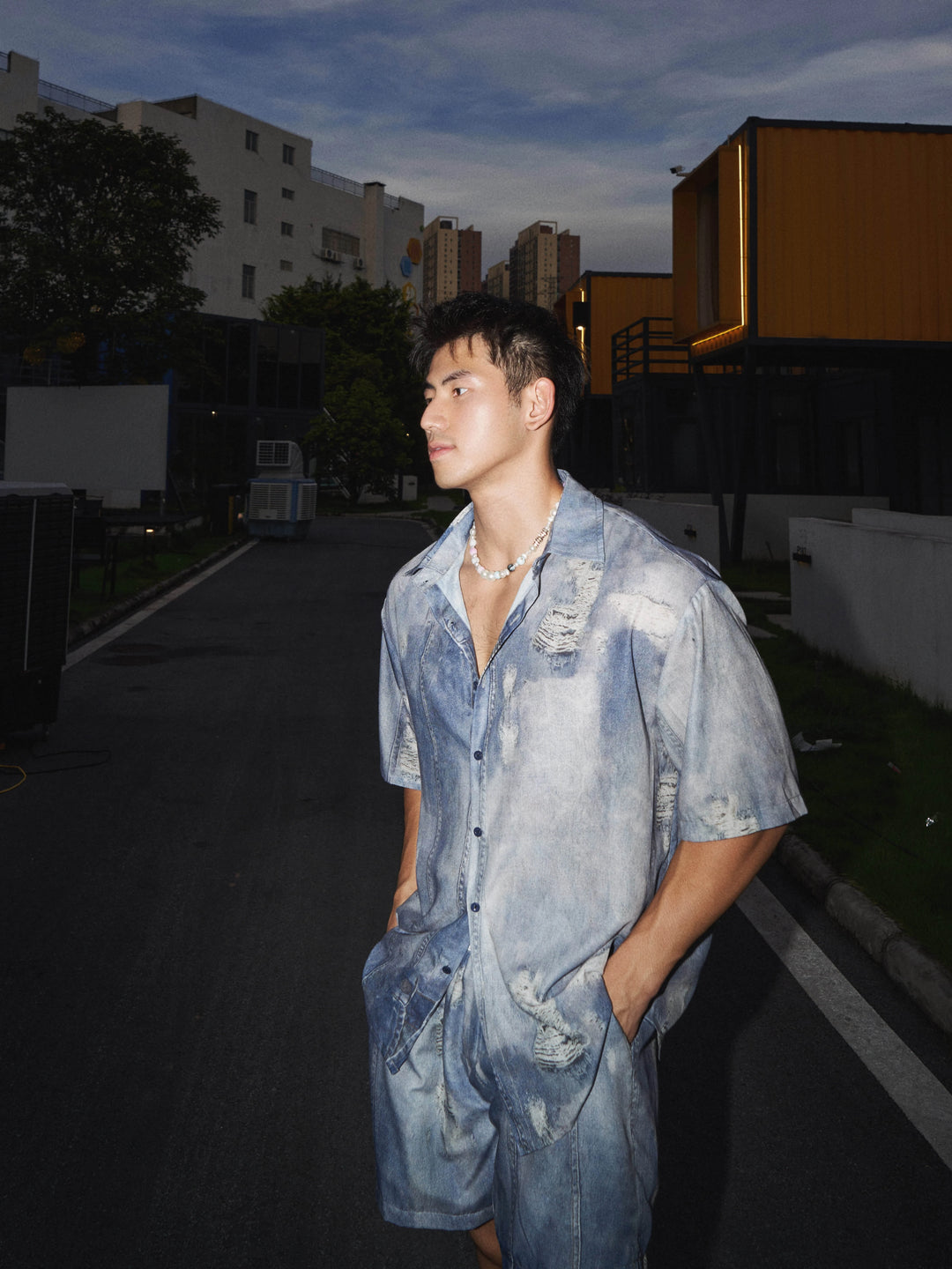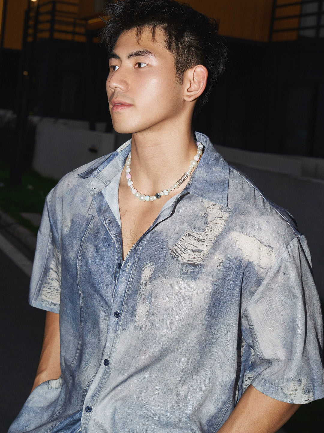 Short Sleeve Imitation Denim Button-Up Shirt