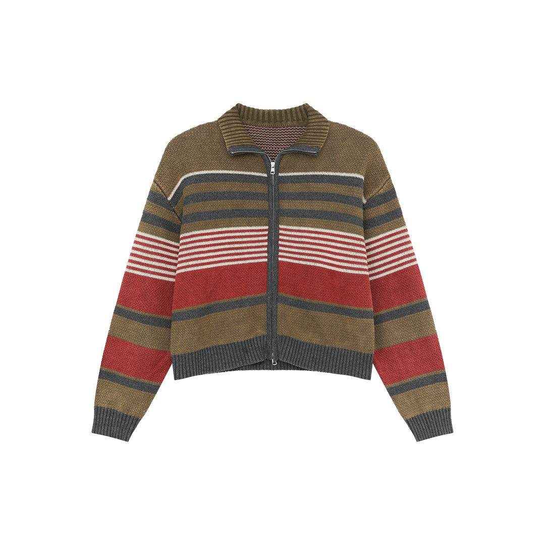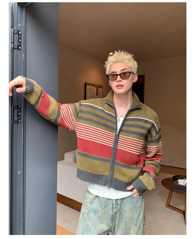 Stand Collar Striped Knitted Cardigan