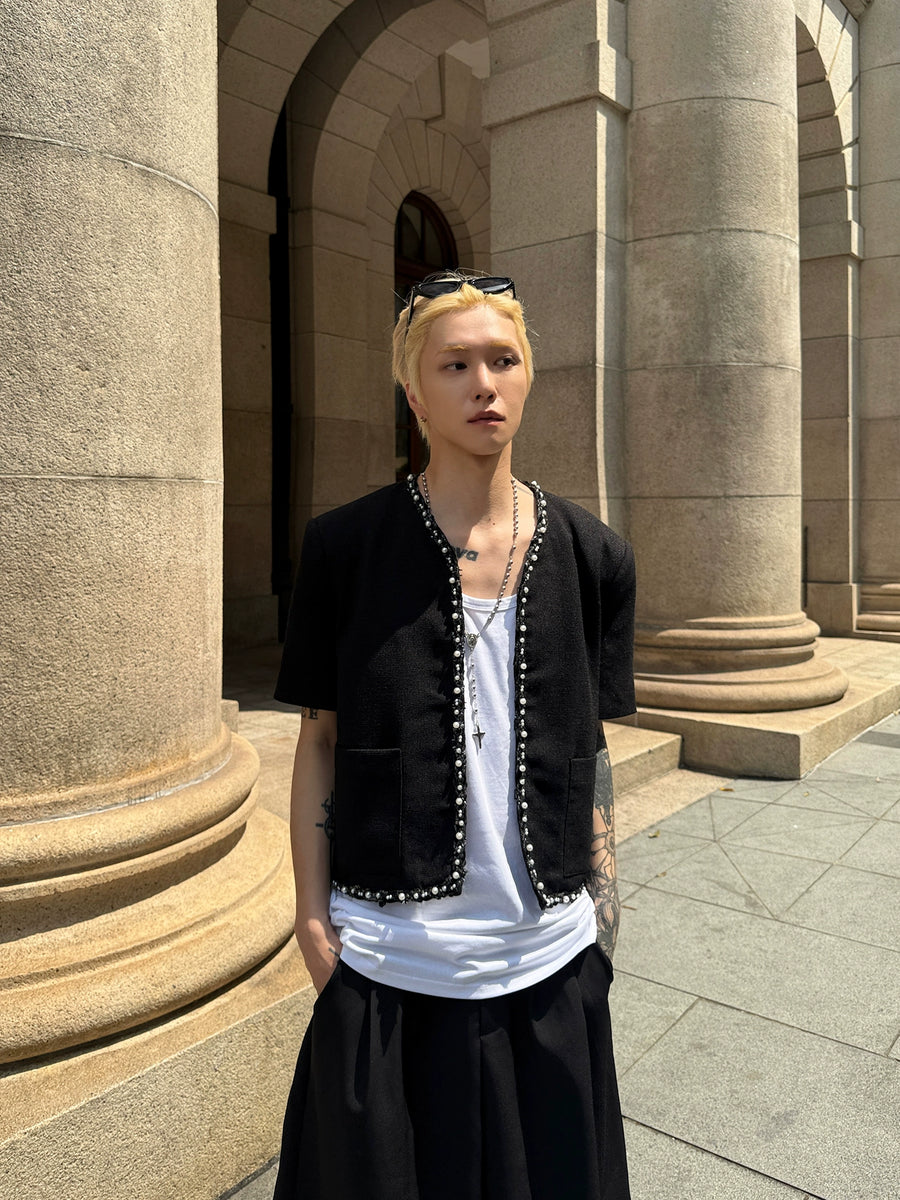 Pearl Trim Woven Short Sleeve Jacket