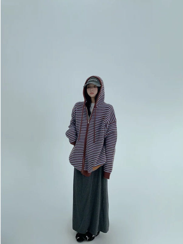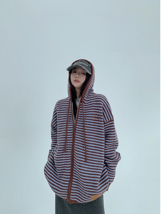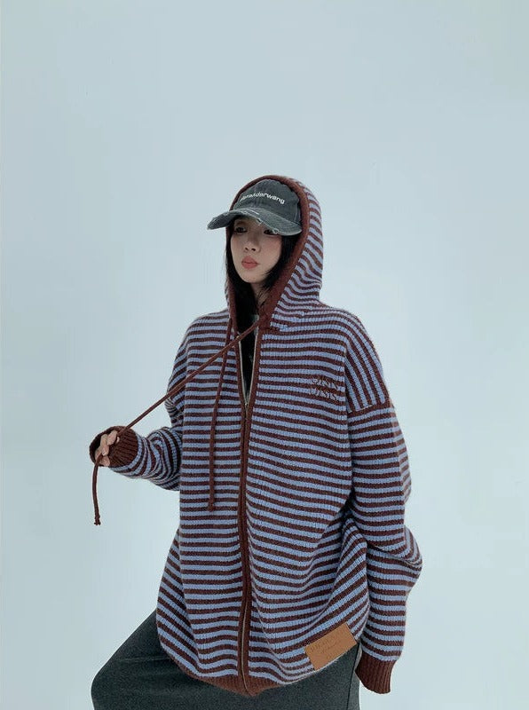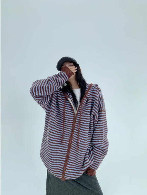 Striped Hooded Knit Sweater Cardigan