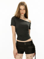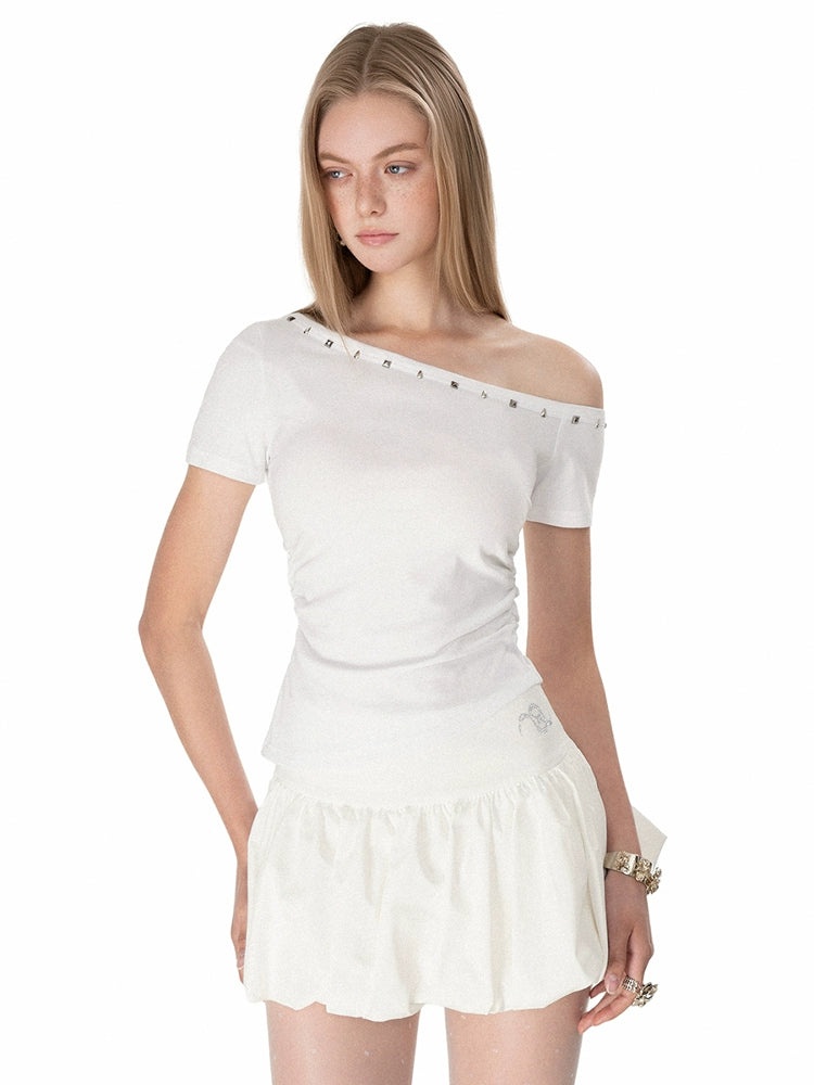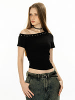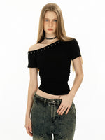 Oblique Shoulder Rivet Short Sleeve Top