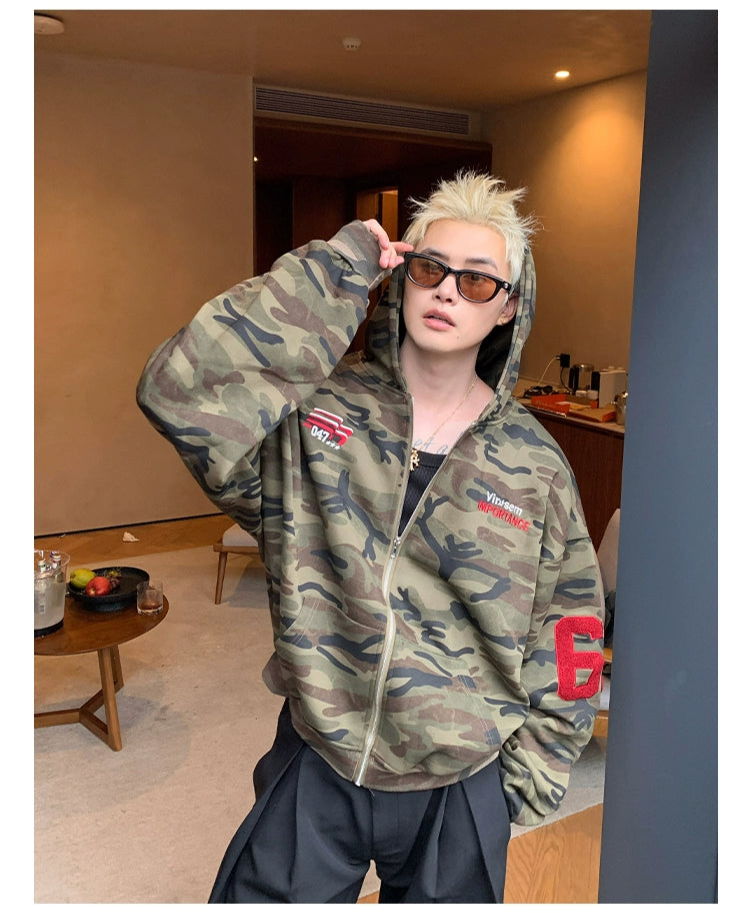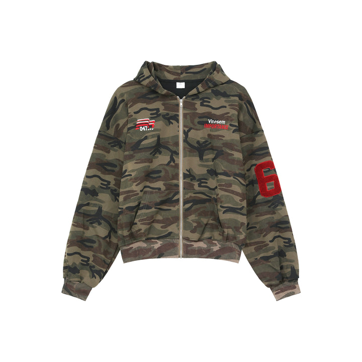 Camouflage Embroidered Zip Up Hooded Sweatshirt