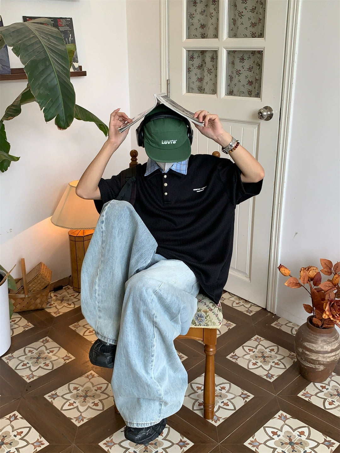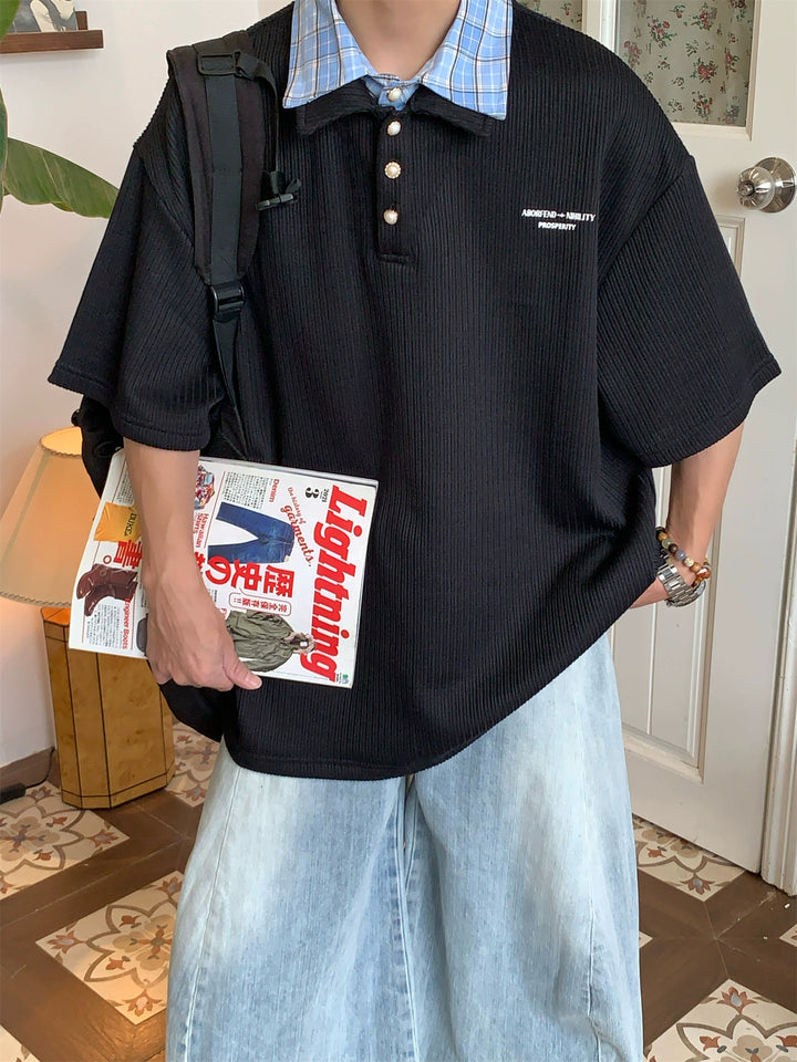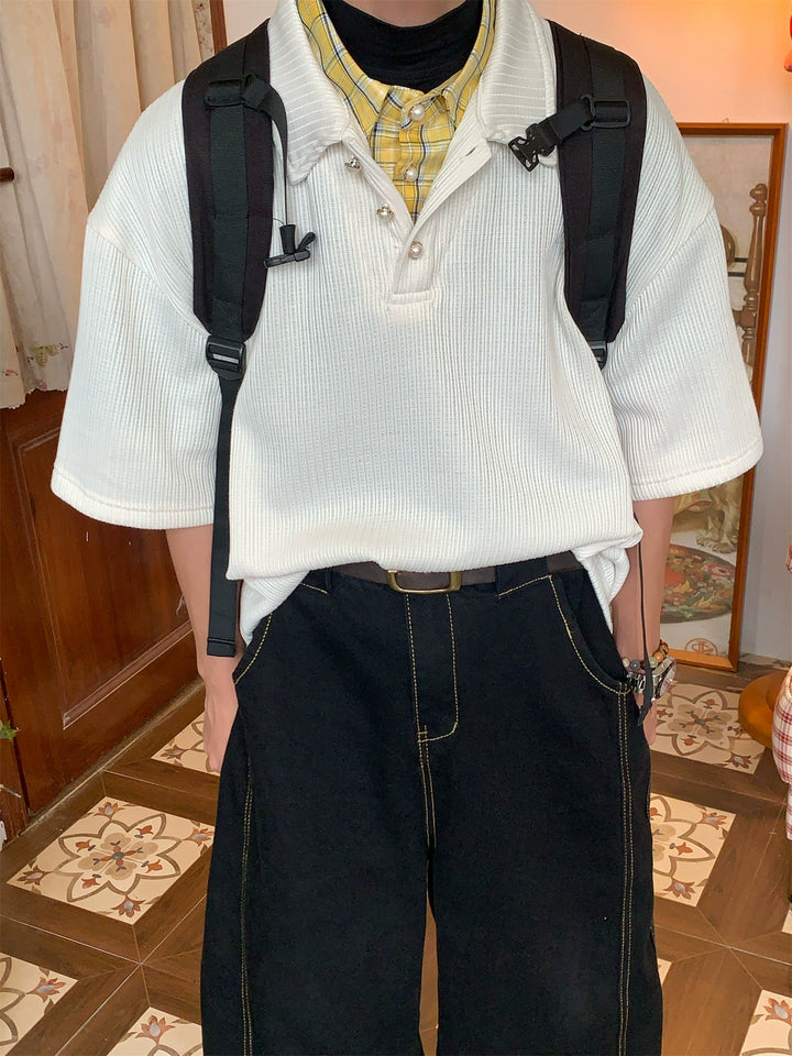 Ribbed Pearl Button Short Sleeve Polo Shirt