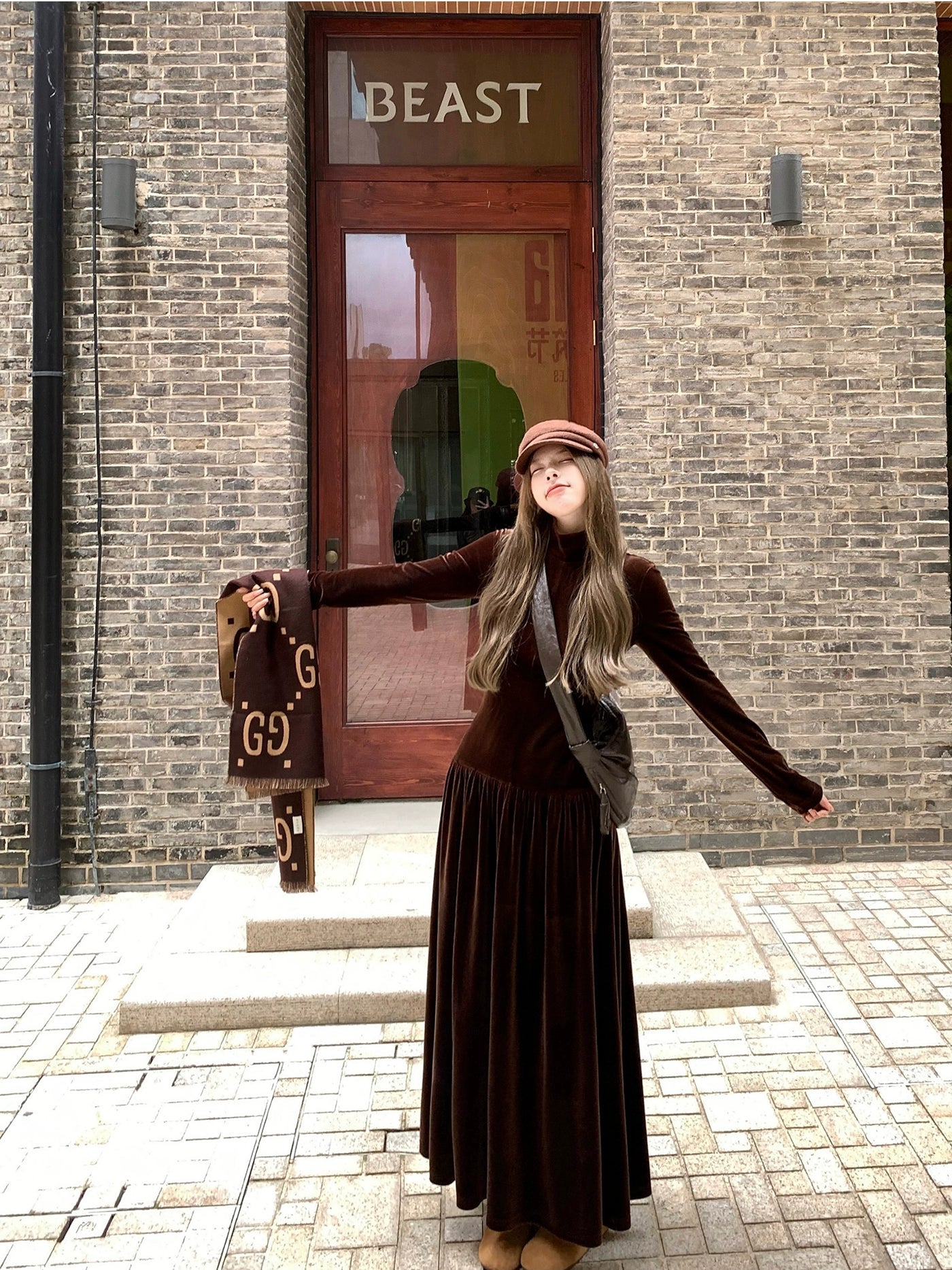Knitted Velvet Long-Sleeve Ruffled Dress