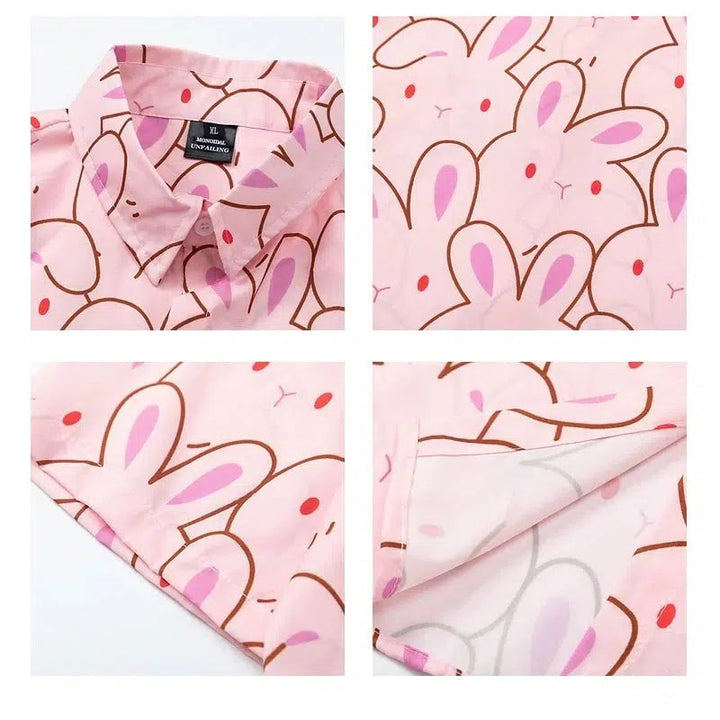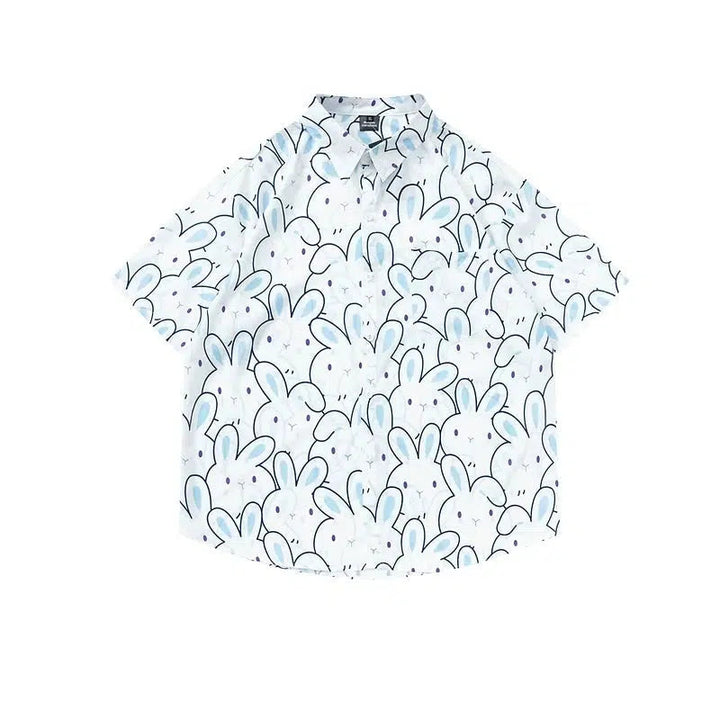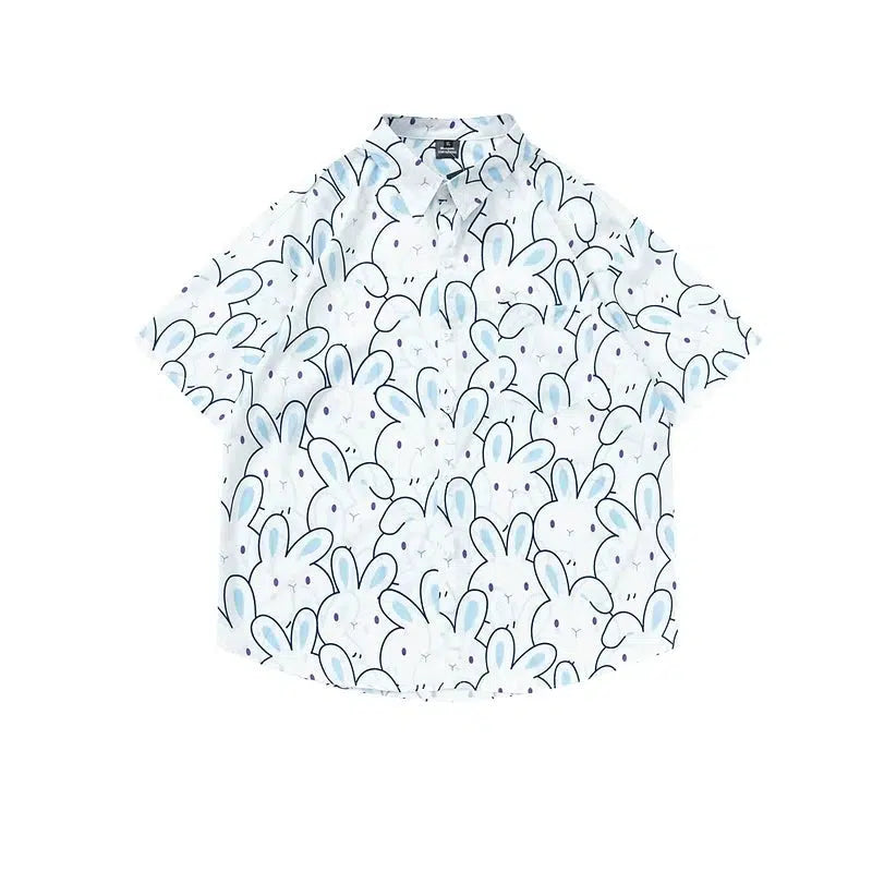 Cartoon Bunny Print Short Sleeve Button-Up Shirt