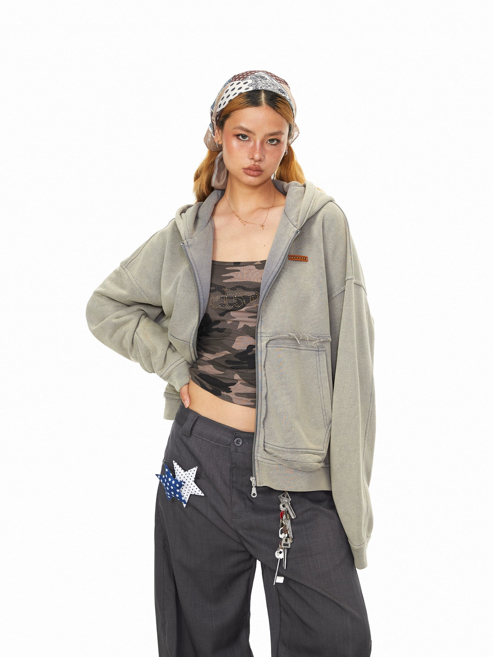 Patchwork Pocket Zip Up Hooded Sweatshirt