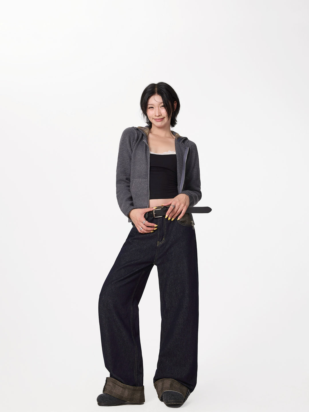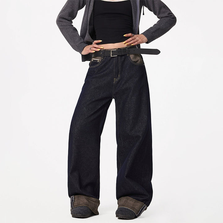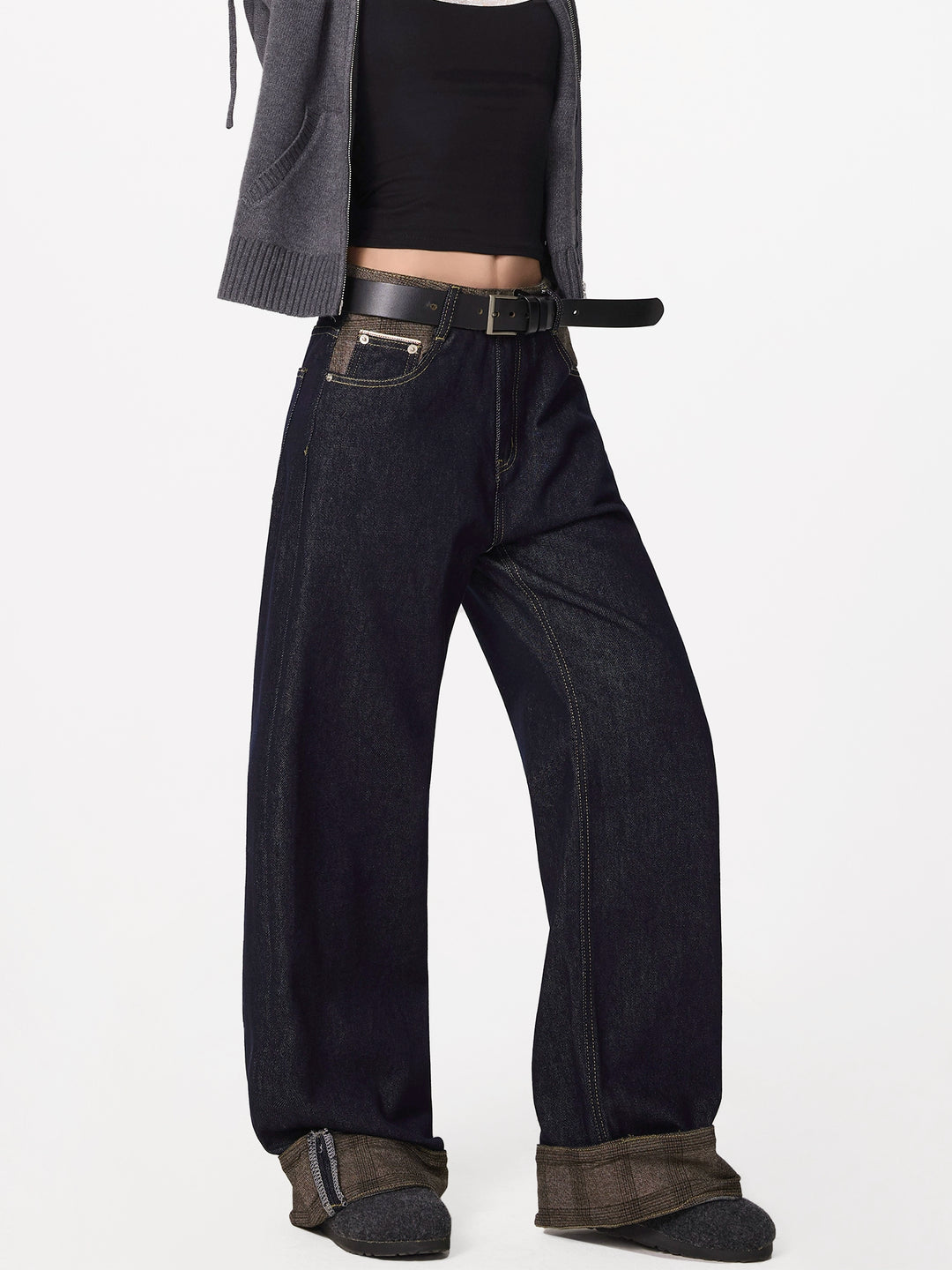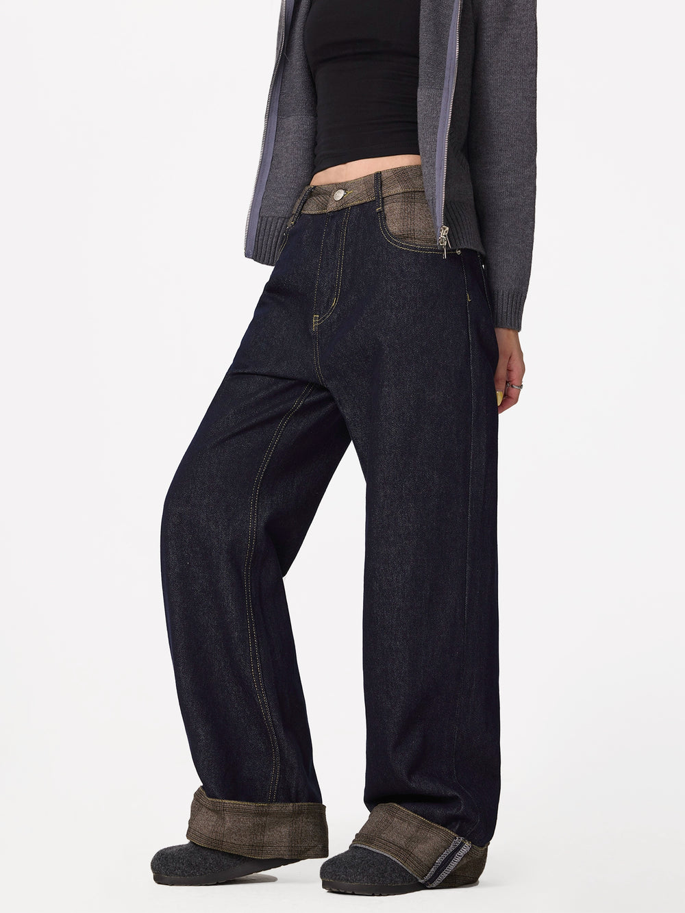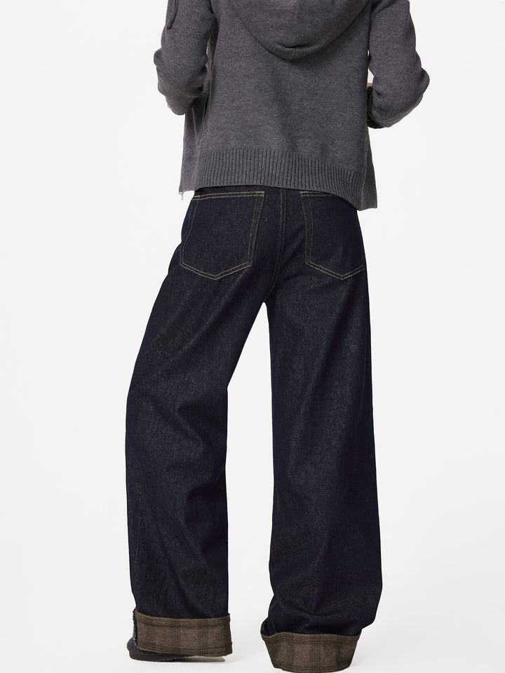 Rolled Cuff Stitching Denim Pants