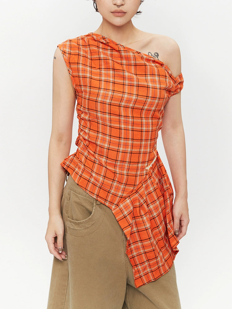 Asymmetrical Off-Shoulder Plaid T-shirt