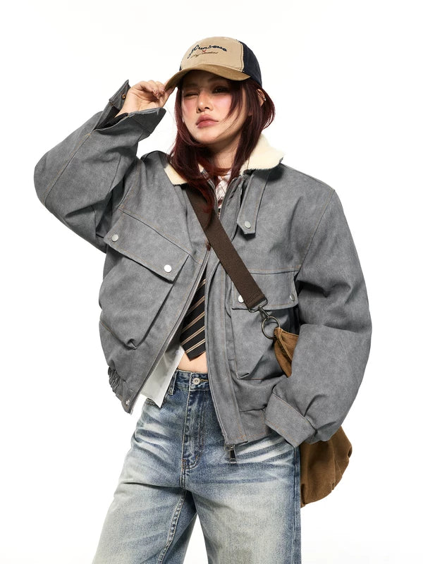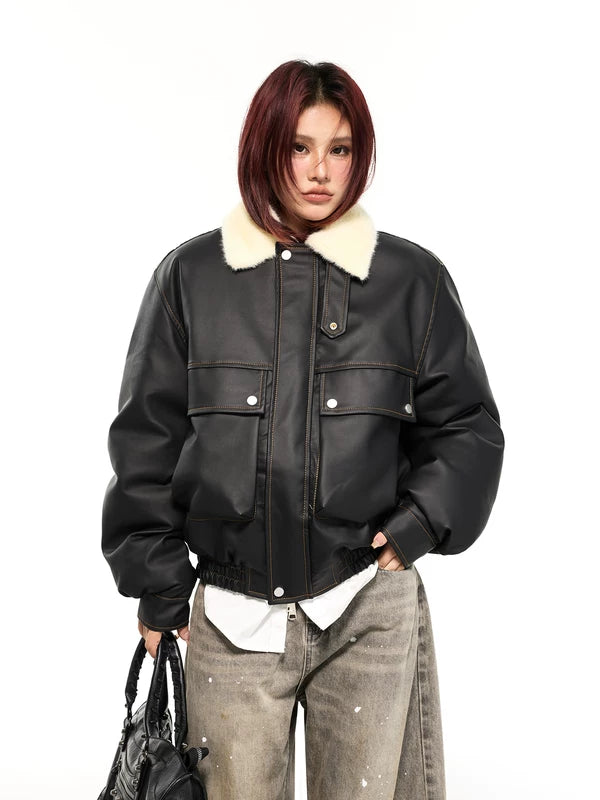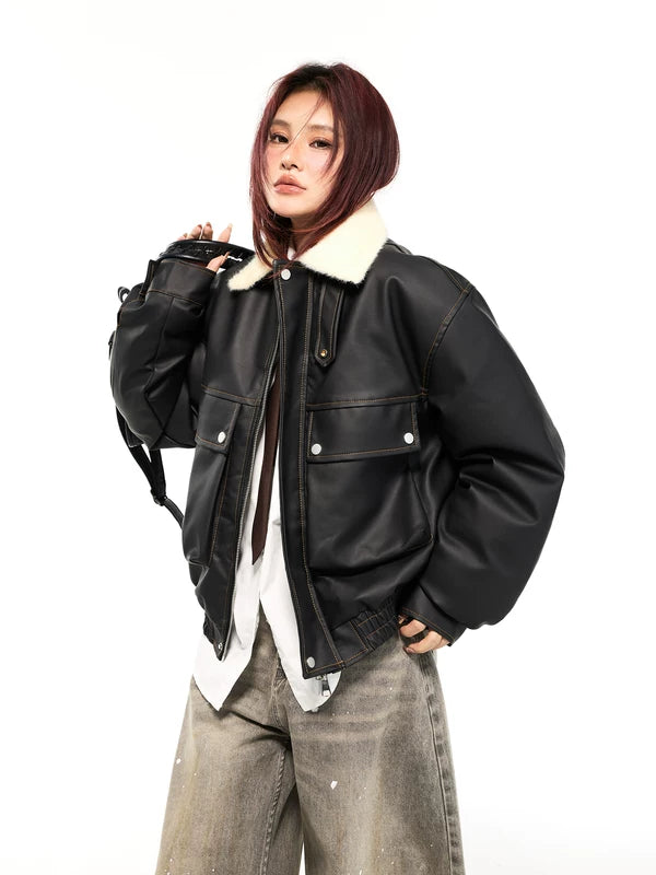 Chaqueta de Cuero Sintético con Cuello de Forro Polar