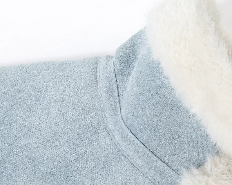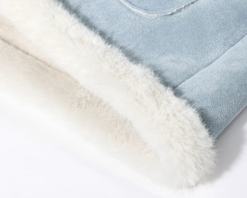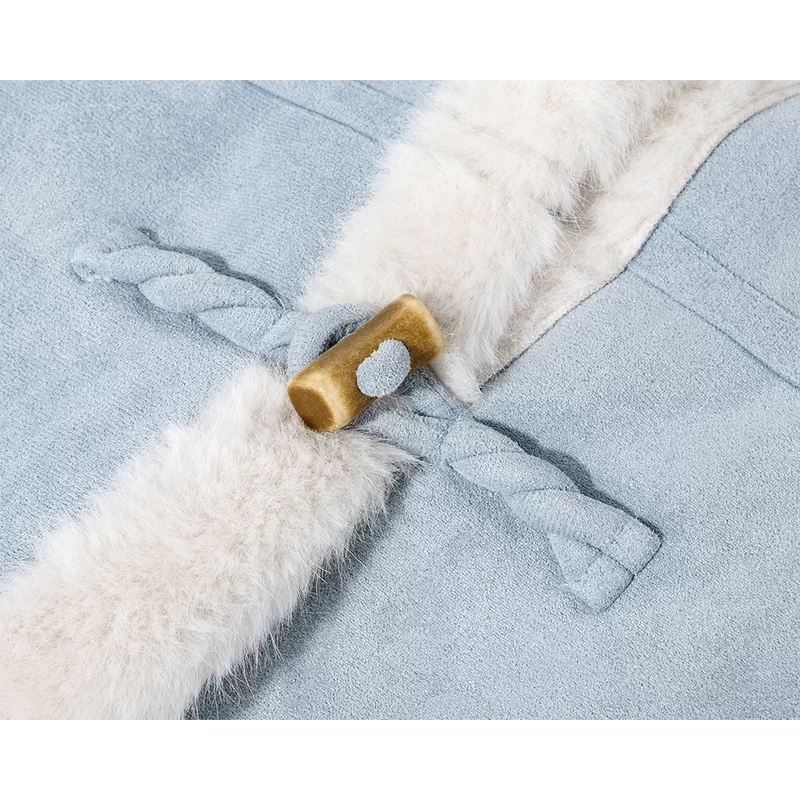 - Forro de pelaje sintético suave y ribete en el cuello, tapeta frontal, puños, dobladillo, bolsillos, y bolsa a juego