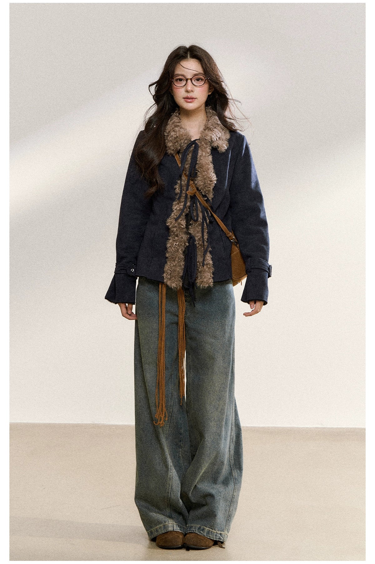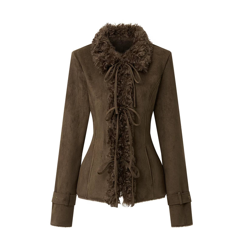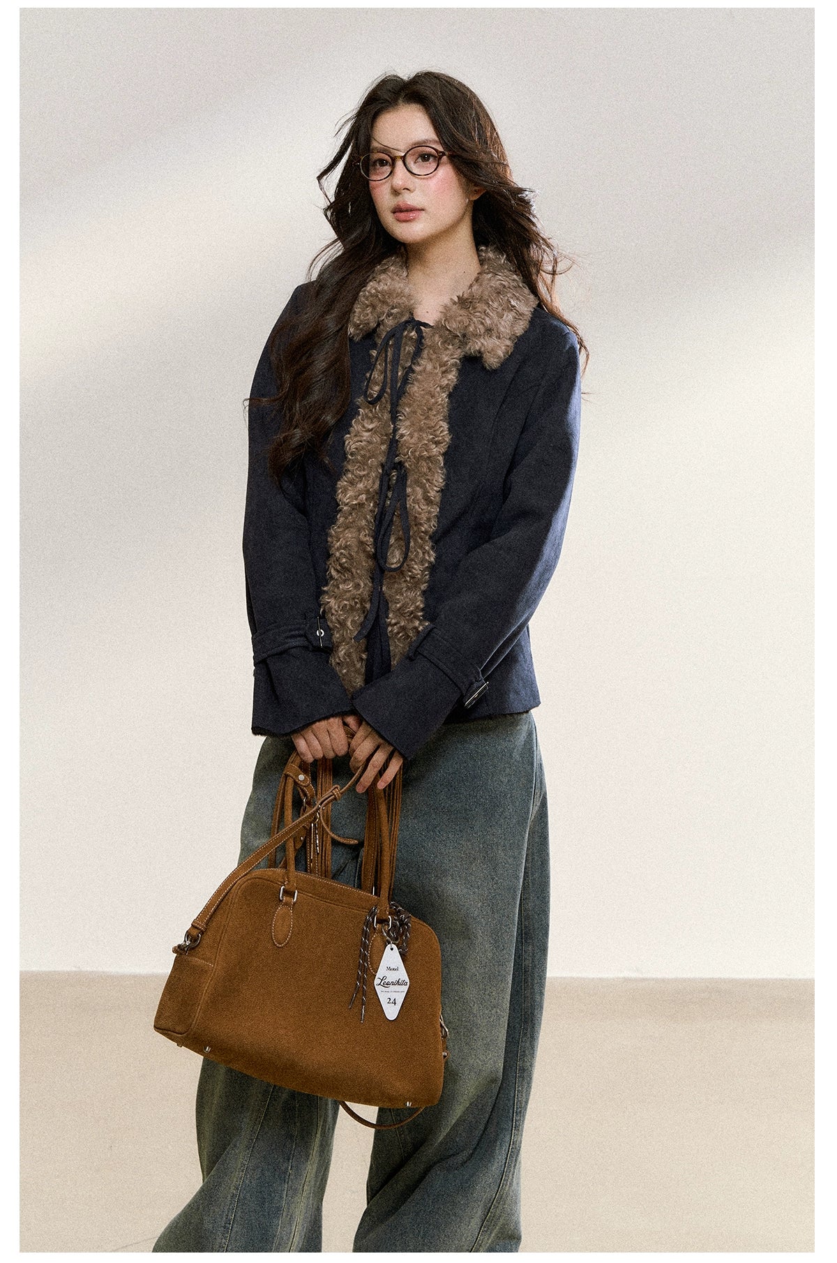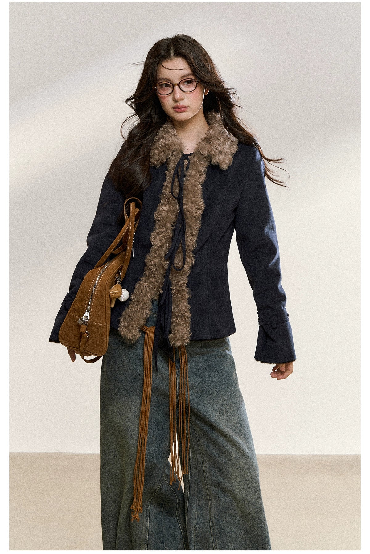 - This vintage faux shearling jacket is designed with the concept of "reviving the classics, recreating warm fashion." It uses premium faux shearling material, and the plush collar provides warmth and comfort, enhancing the retro vibe. The collar tie design adds a touch of casual elegance and breaks the stereotypes of traditional faux shearling jackets. Cuff details showcase fine workmanship and the overall fit is sleek and stylish. It perfectly blends vintage style with modern fashion, making it easy to showcase individuality during the cold season.