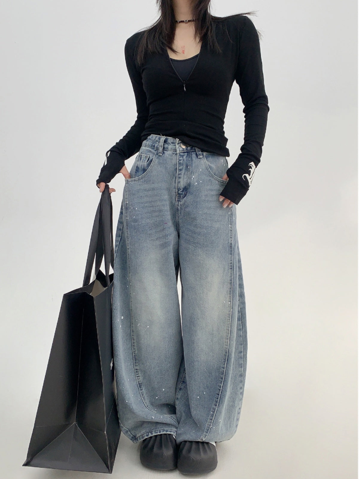 Wide-Leg Denim Paint Dot Pants