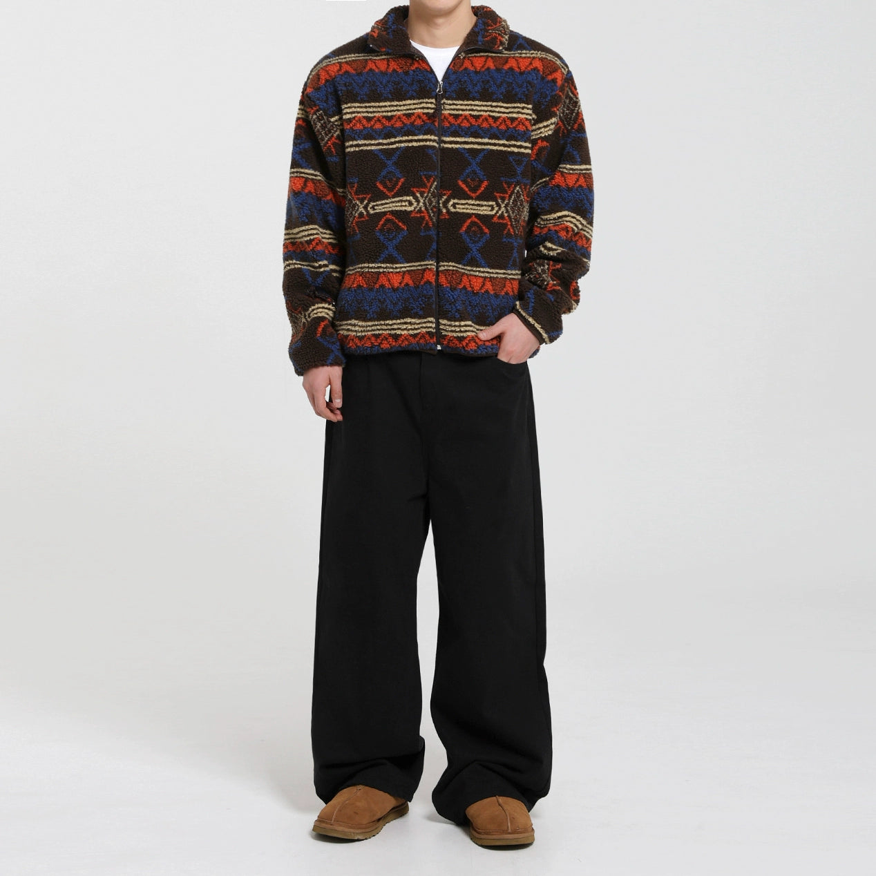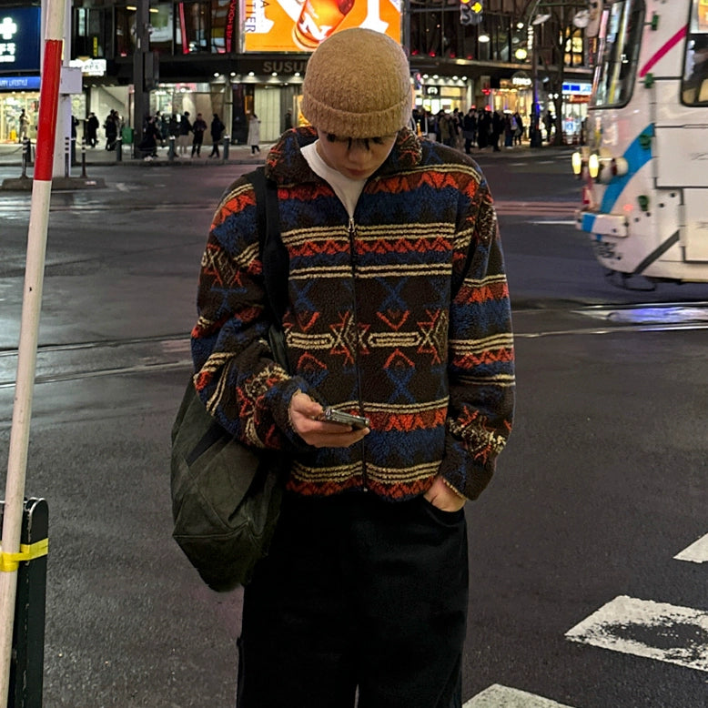 Veste zippée en fourrure d'agneau à motif ethnique