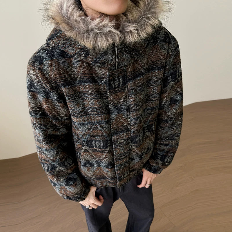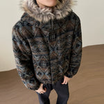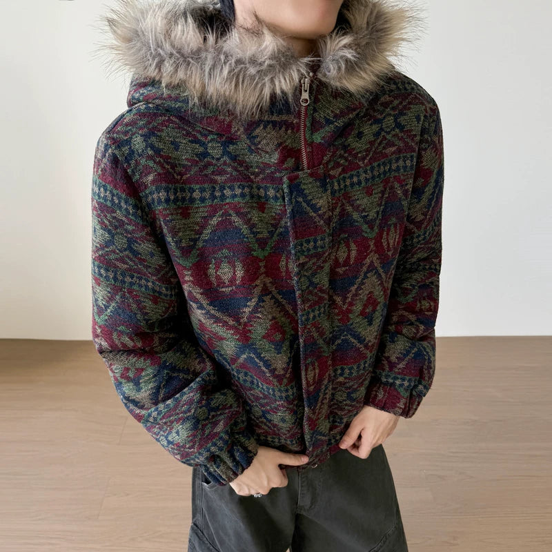 Veste à capuche avec col en fourrure à motif rétro
