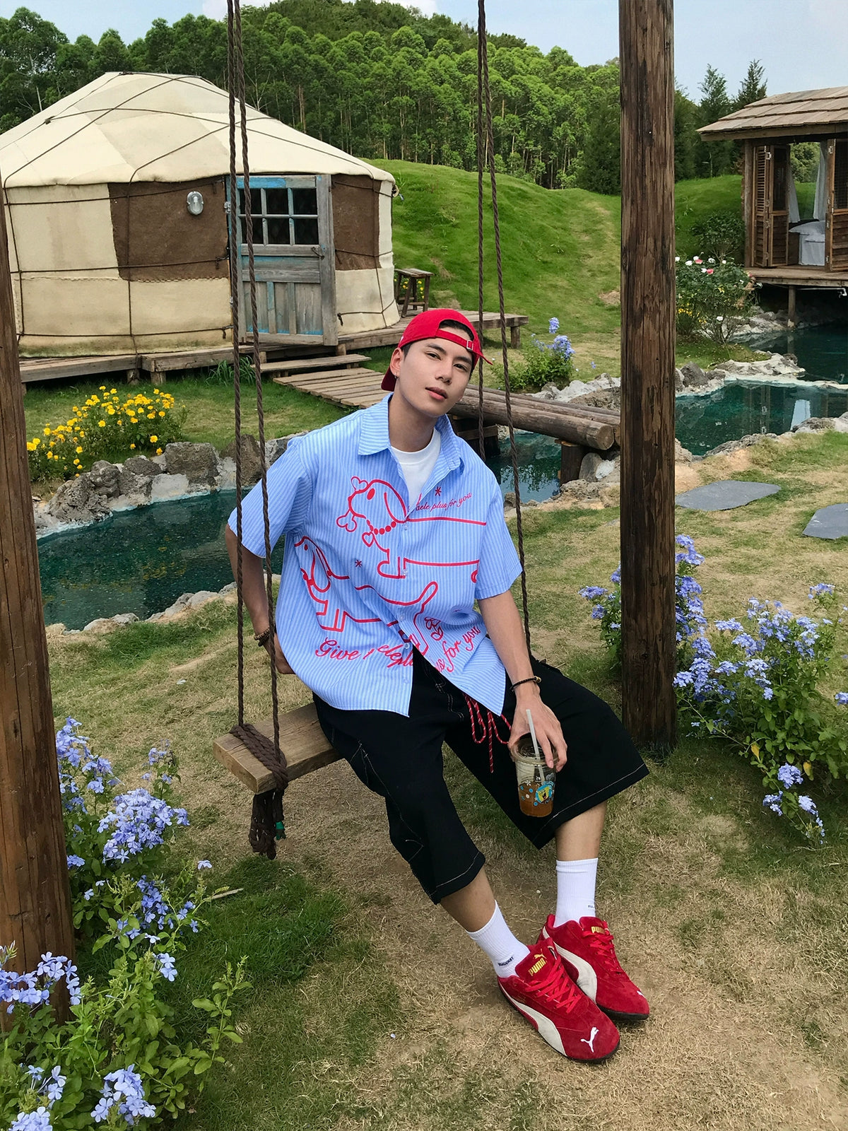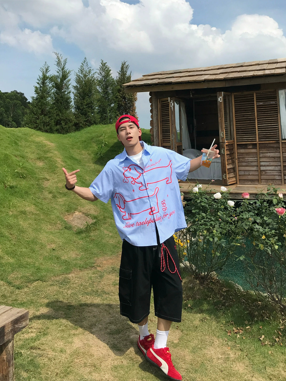 Chemise à manches courtes rayée avec impression de teckel