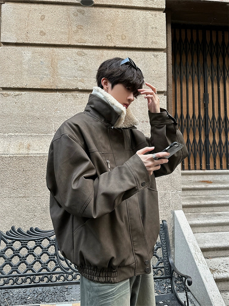 - Design oversized décontracté avec un petit col en laine d'agneau retourné pour une apparence chaleureuse.