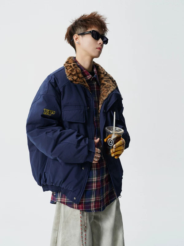 Giacca invernale imbottita con colletto a leopardo