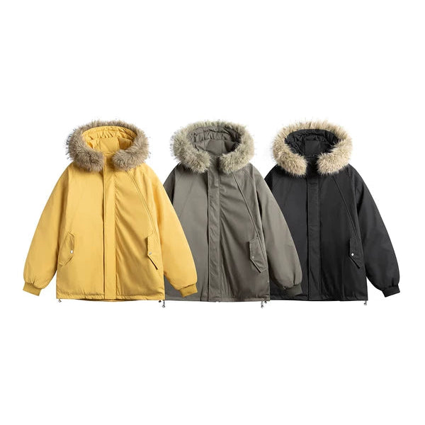 Giacca in piuma con cappuccio invernale e colletto in pelliccia