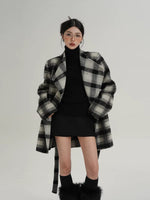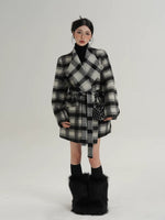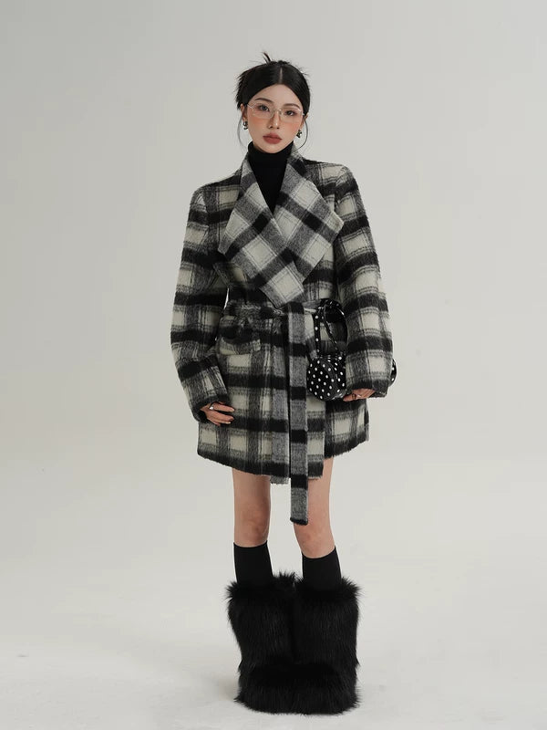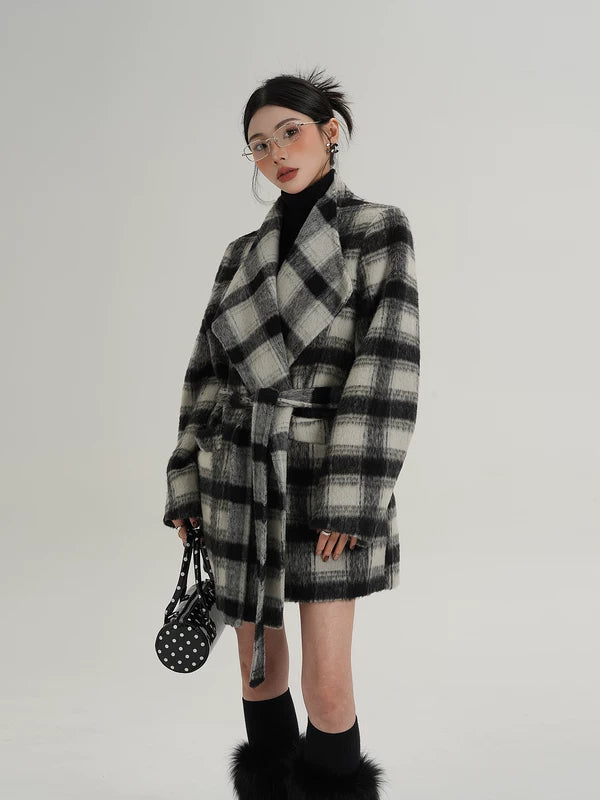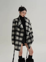 Cappotto di lana a metà lunghezza con cintura a quadri