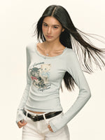 Maglione a collo alto con stampa di gatti e scollatura rotonda in pizzo