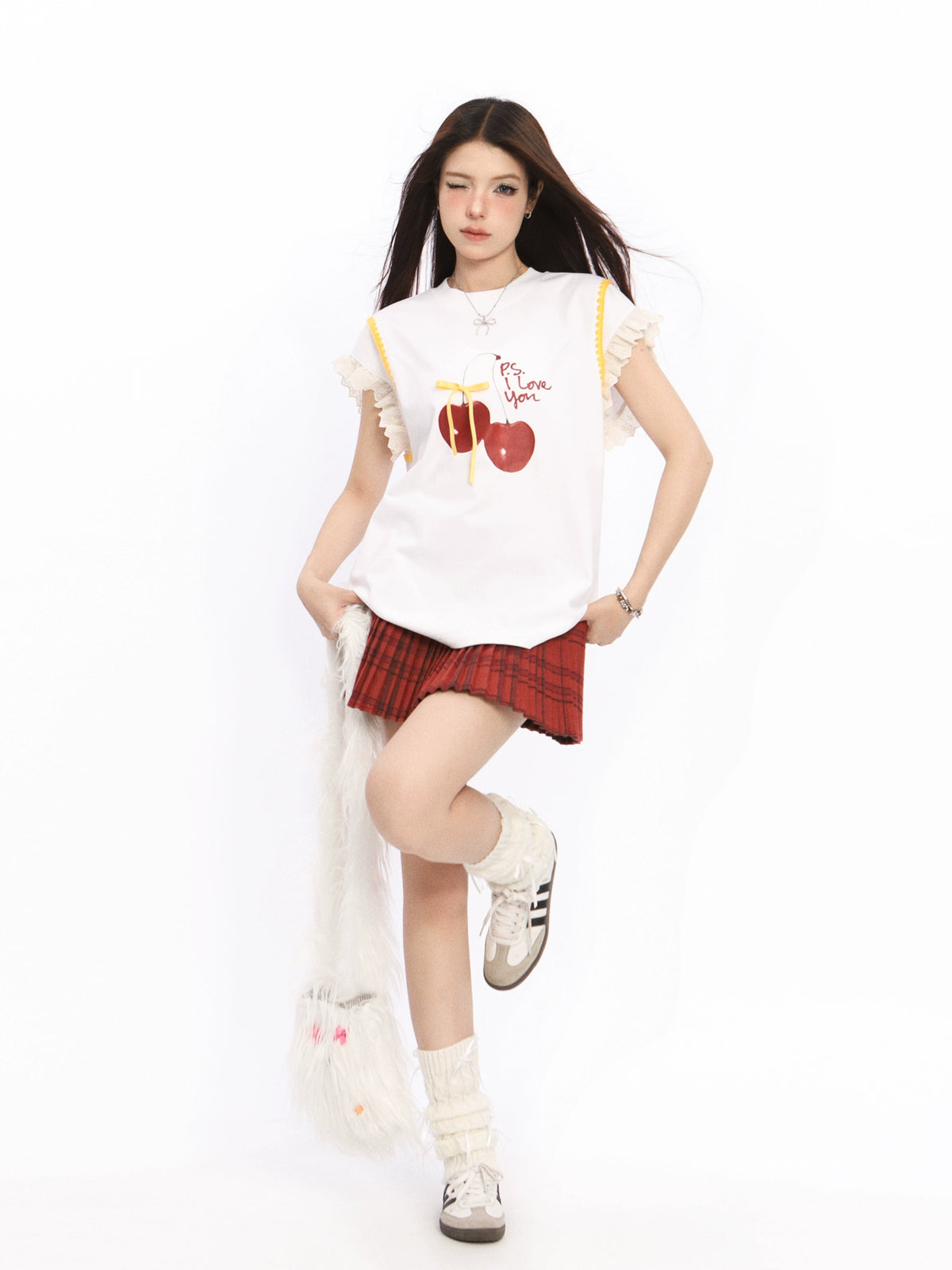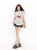 Top a collo alto con grafica di ciliegie e maniche in pizzo