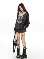Top in raso con scollo a V in pizzo e maniche lunghe