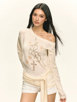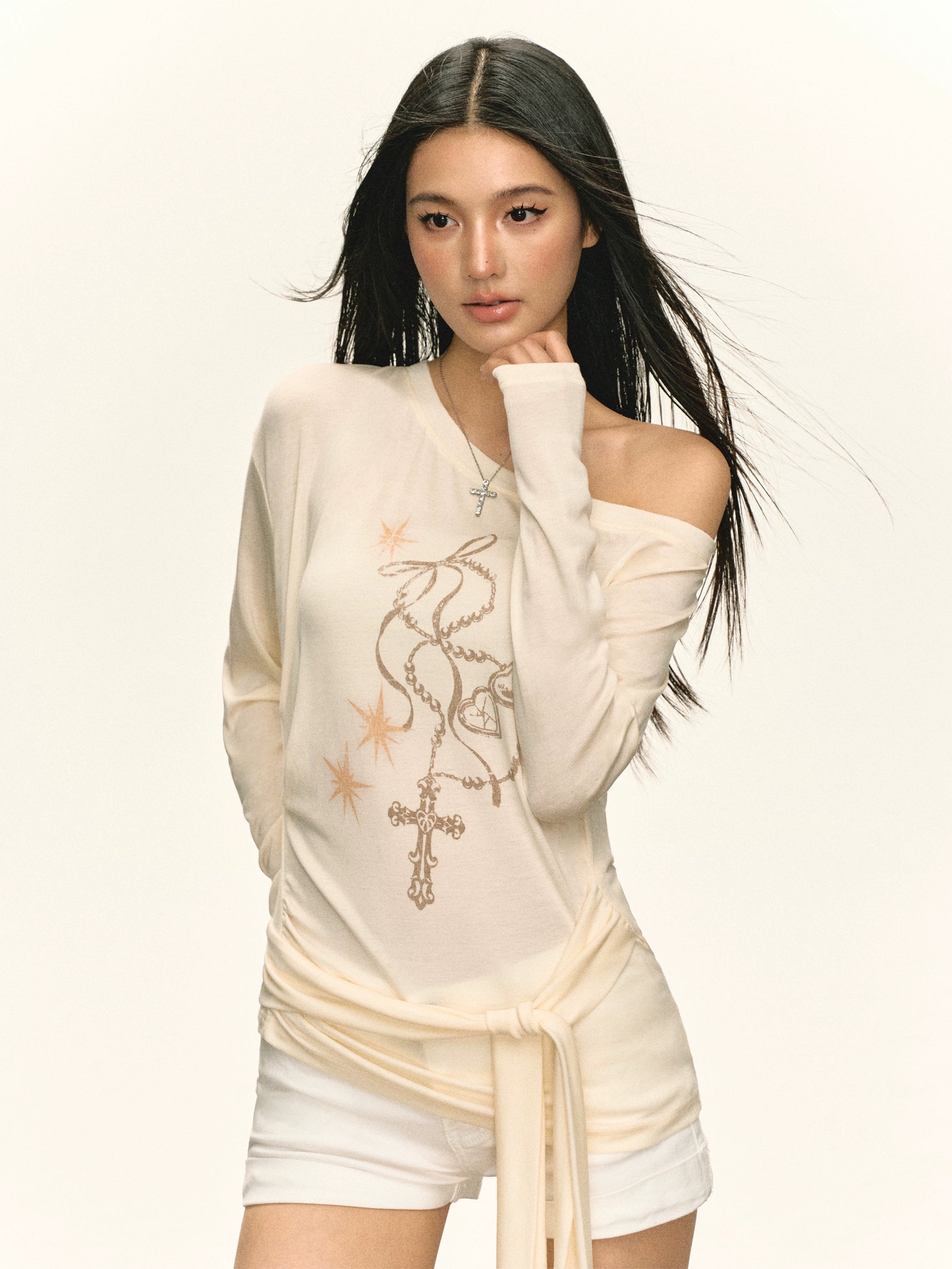 T-Shirt grafico a maniche lunghe con spalle scoperte
