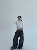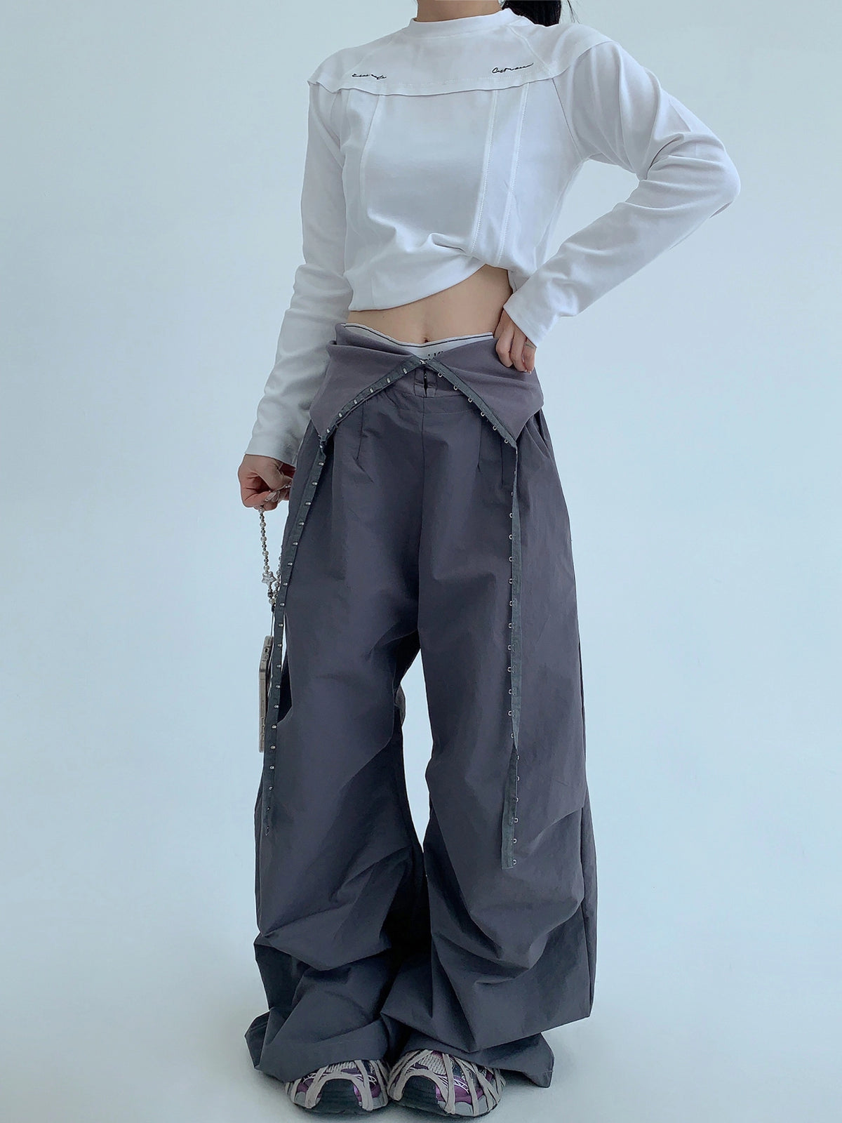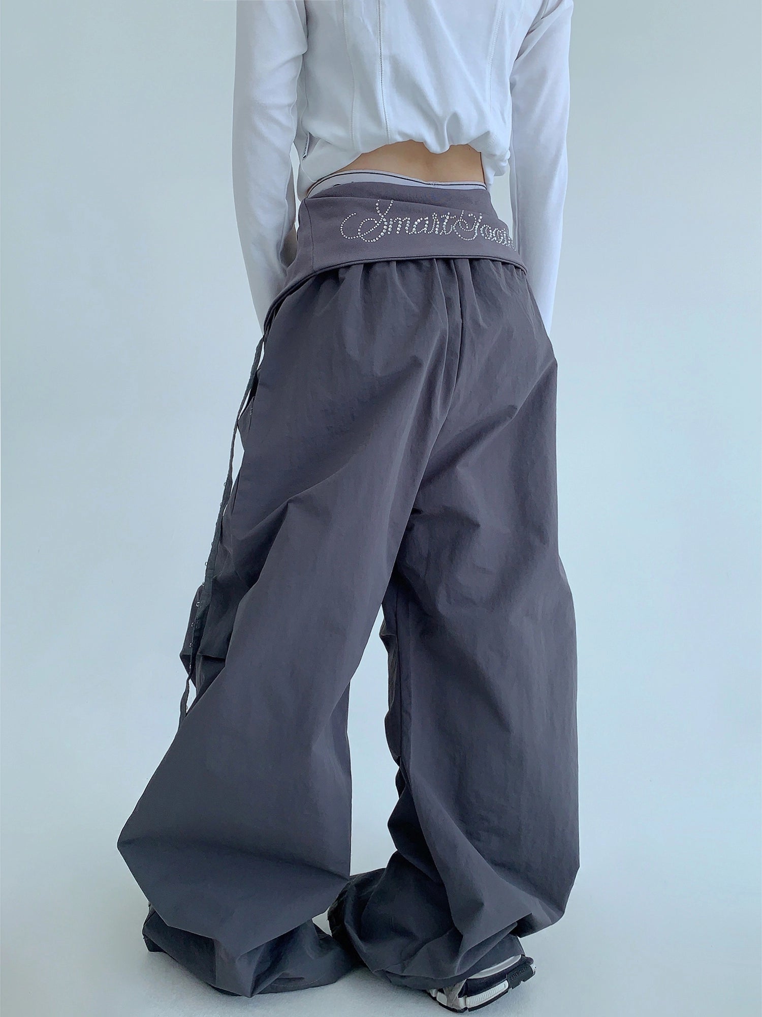 - Design: stile casual semplice / gamba larga rilassata / cintura in tessuto a patchwork / cintura convertibile con chiusura a bottoni completa / lettering artigianale in strass sulla vita posteriore / vestibilità casual oversize con texture morbida