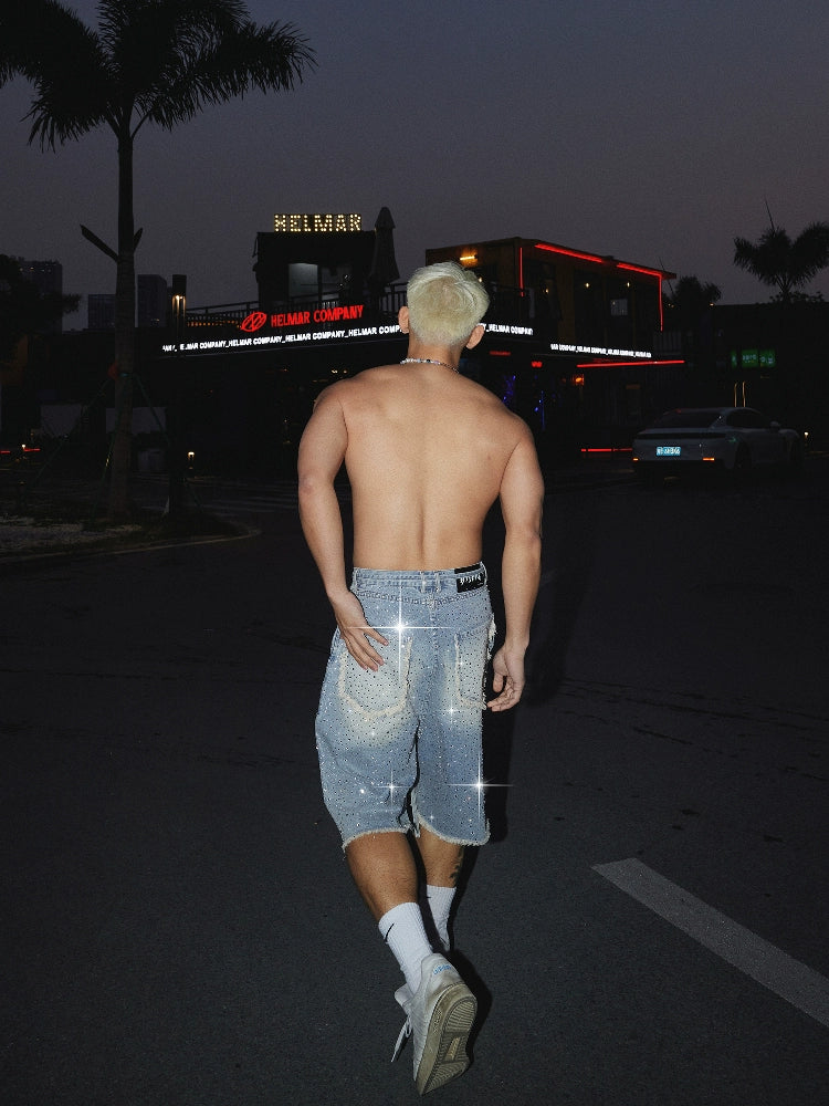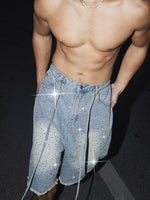 Pantaloni cropped larghi con bordo grezzo e decorati con diamanti