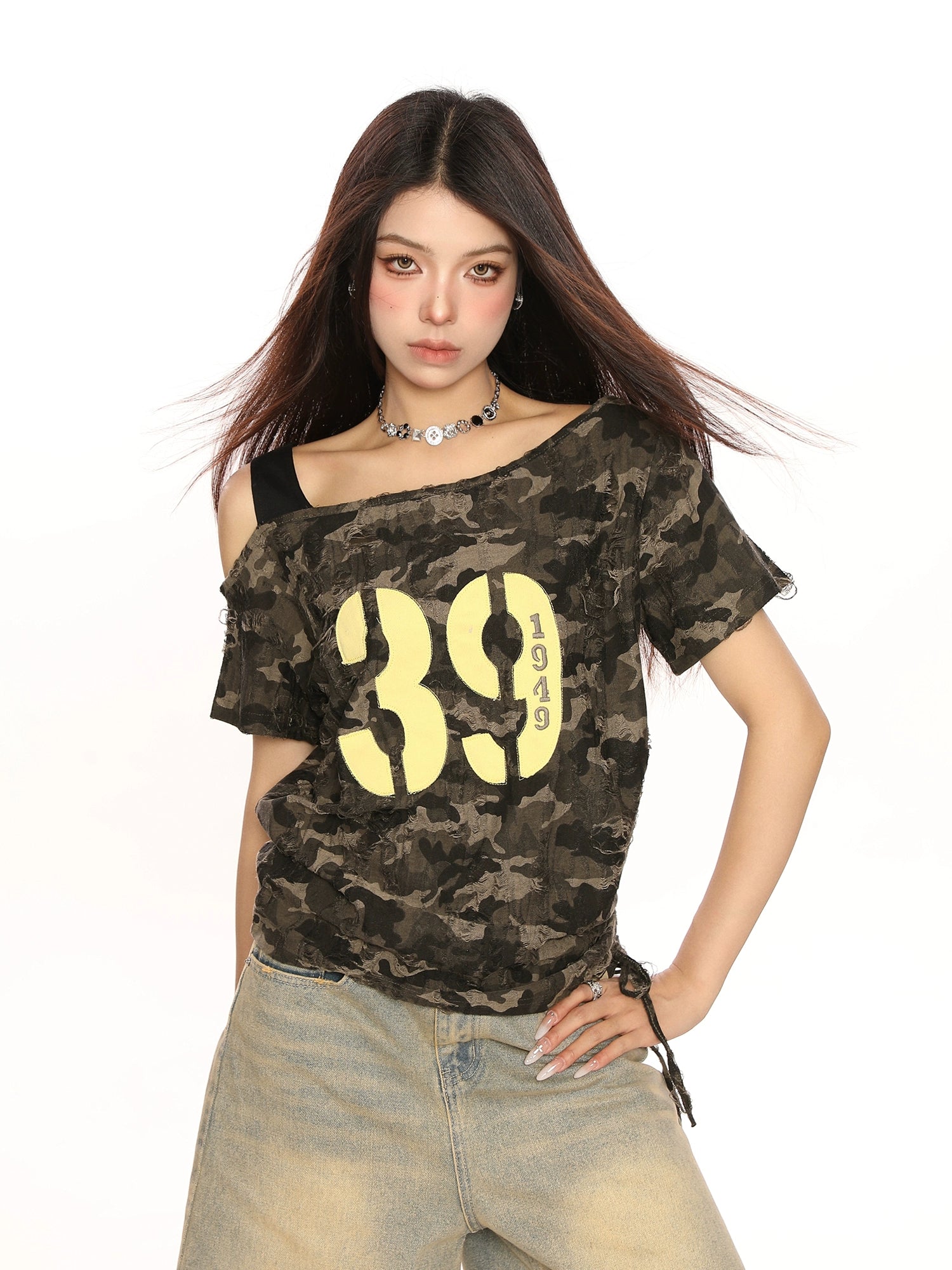 Top lungo a maniche lunghe camouflage con spalle scoperte