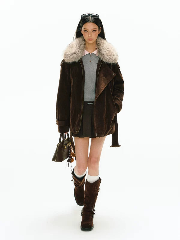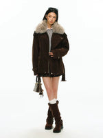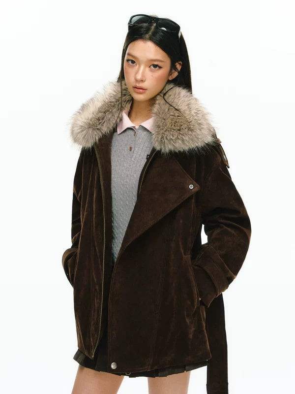 取り外し可能なファー襟のベルト付きキルティングジャケット
