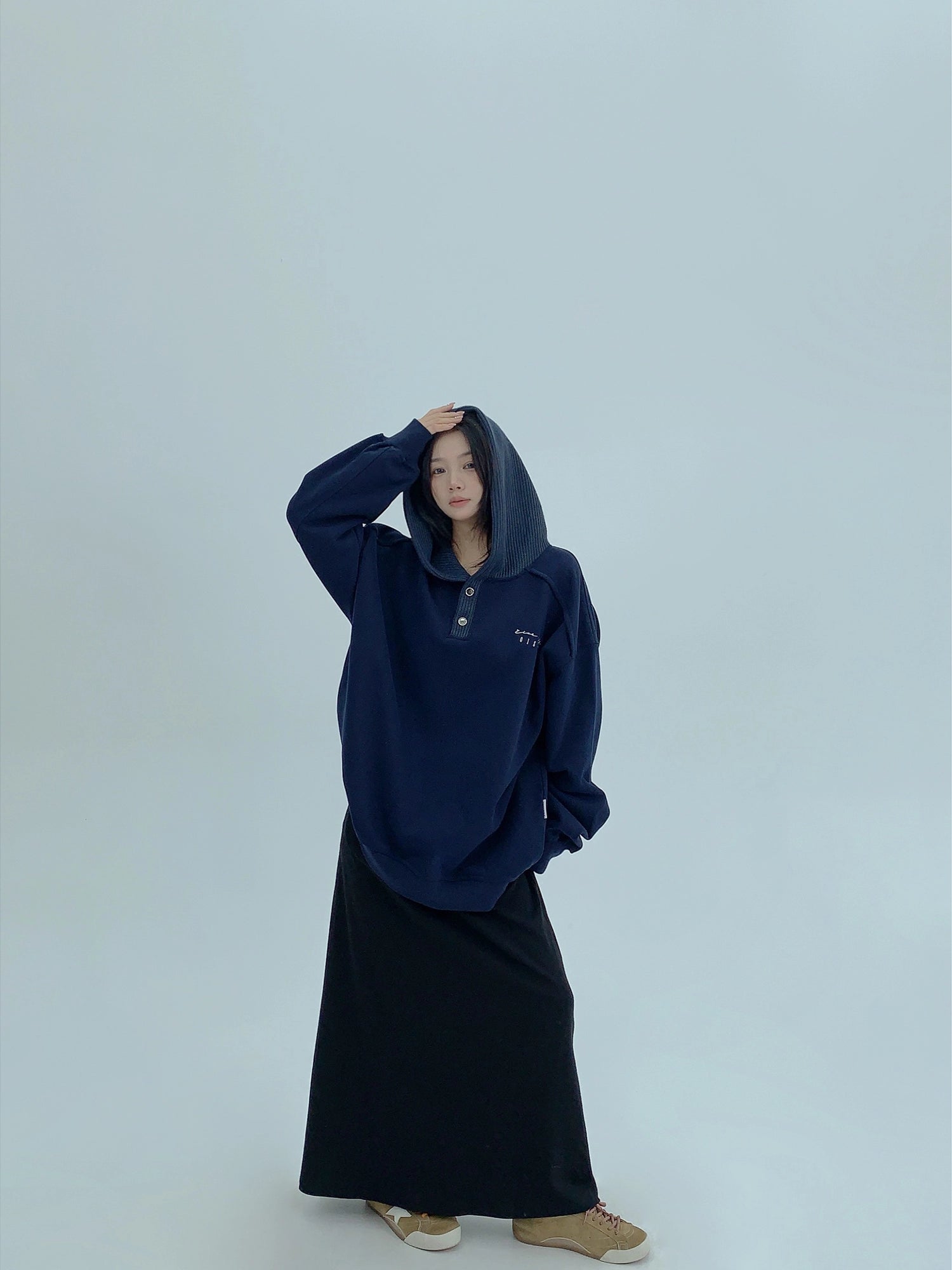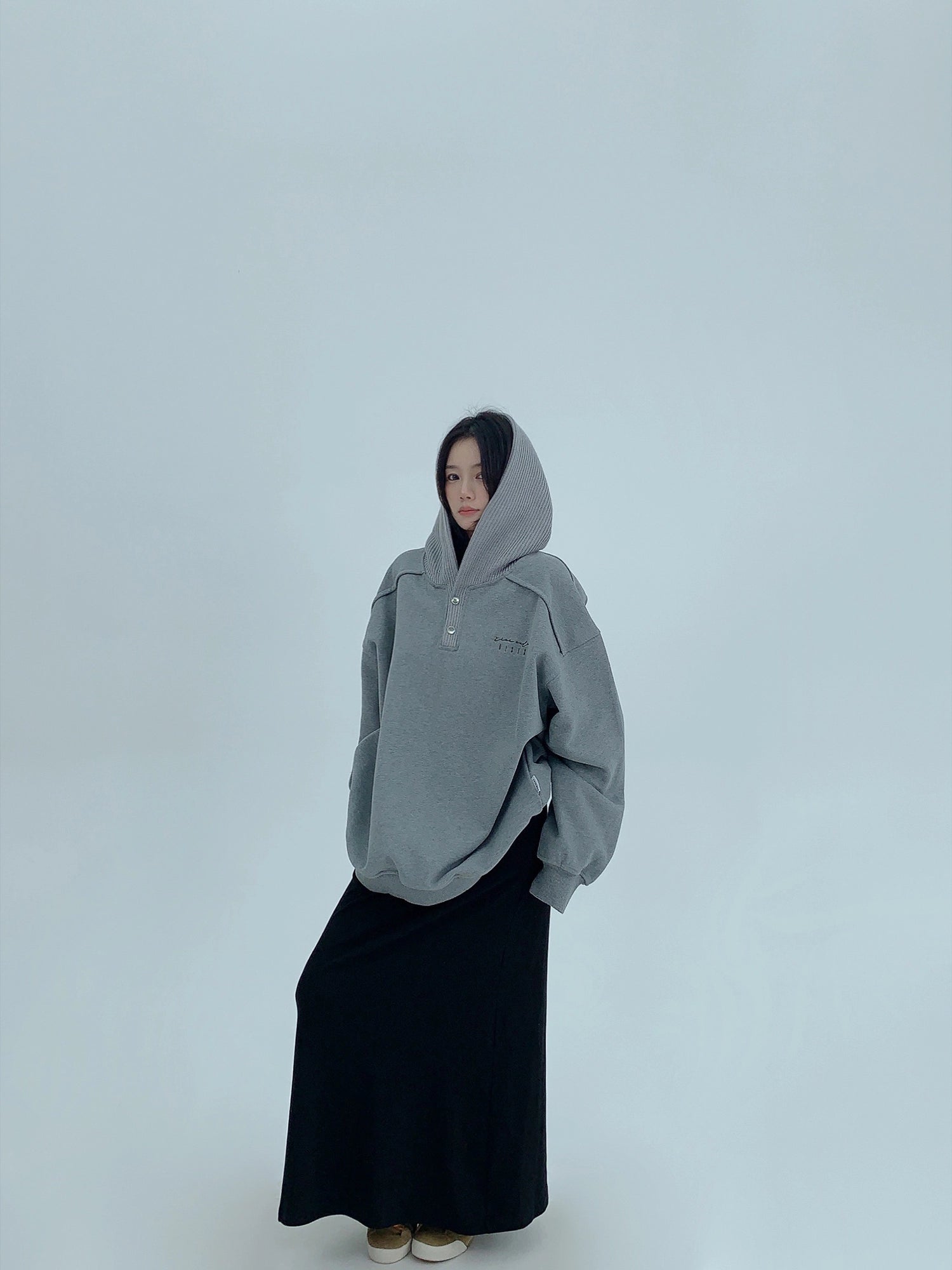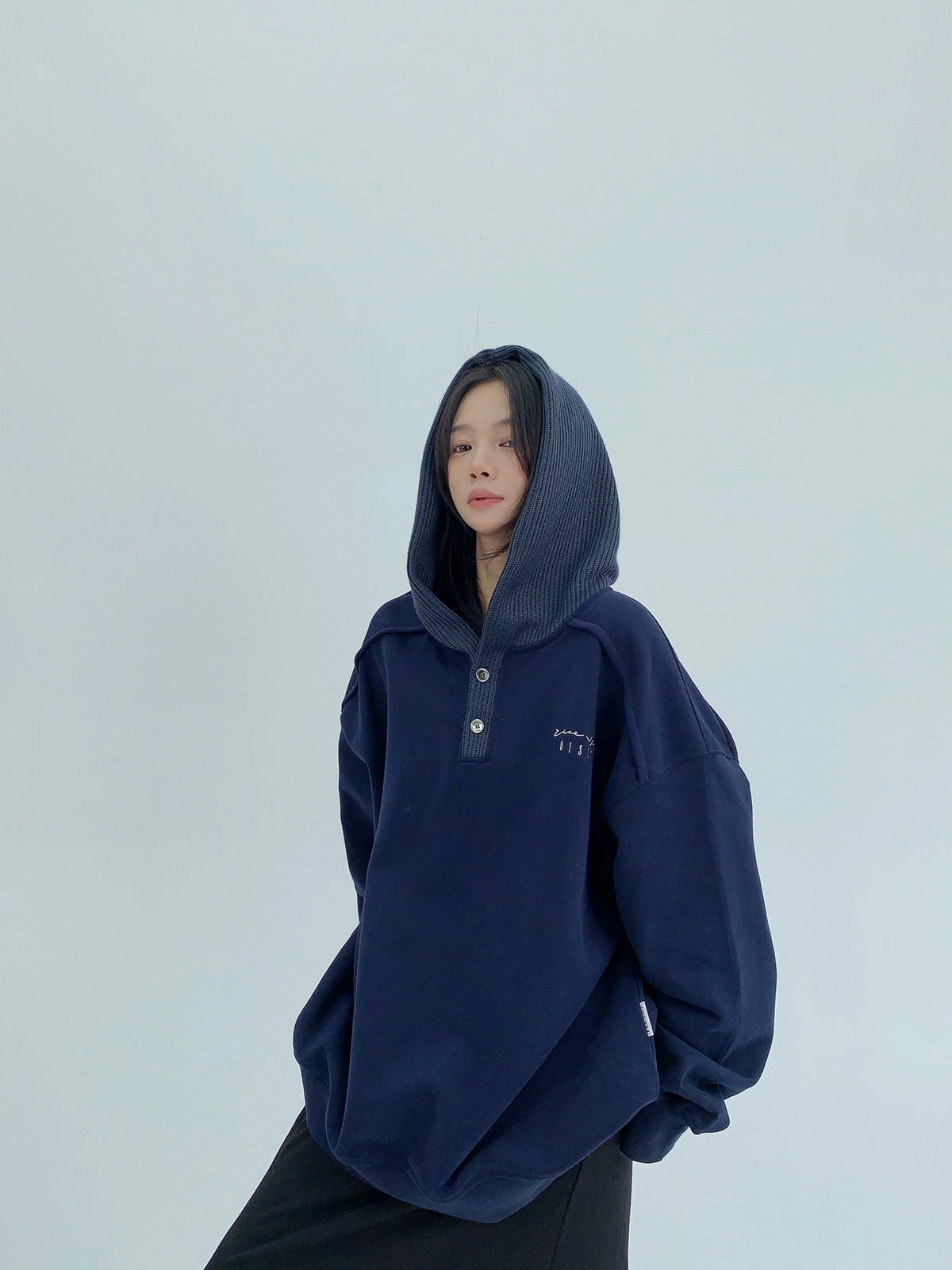 オーバーサイズのフリースライニングヘンリーフーディプルオーバー