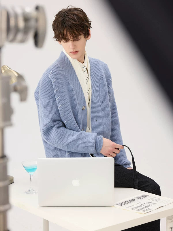 - 肩の装飾的な白いステッチが単色ニットの単調さを破り、アーティスティックな雰囲気を与える