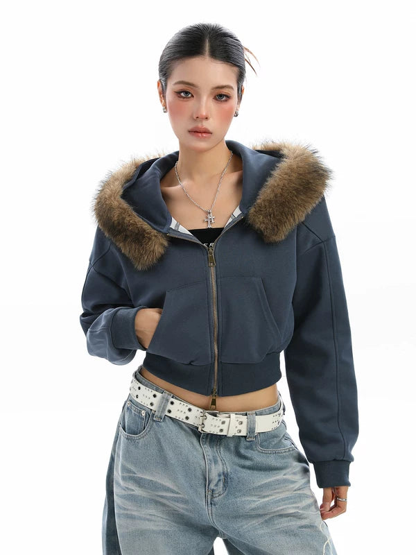 取り外し可能なフェイクファー付きフードクロップドジャケット