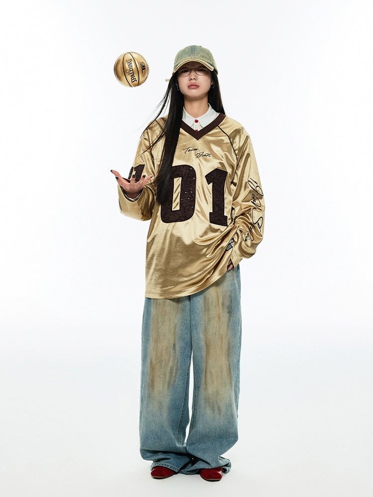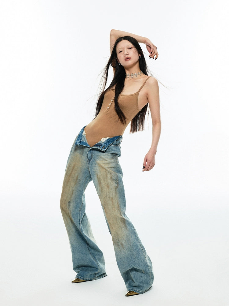 レトロウォッシュワイドレッグストレートジーンズ